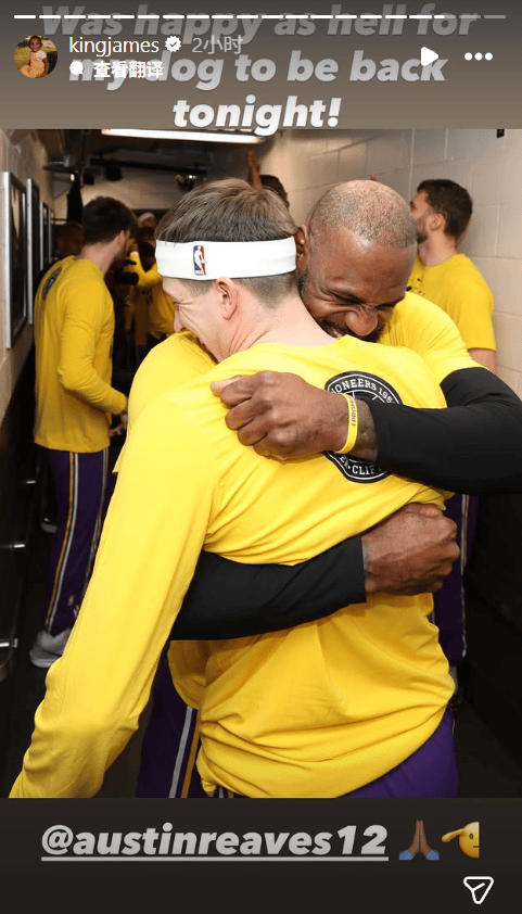 赛后,勒布朗-詹姆斯ins晒出了一张与里夫斯的合照并写道:“非常高兴我的兄弟今晚能够回归!”