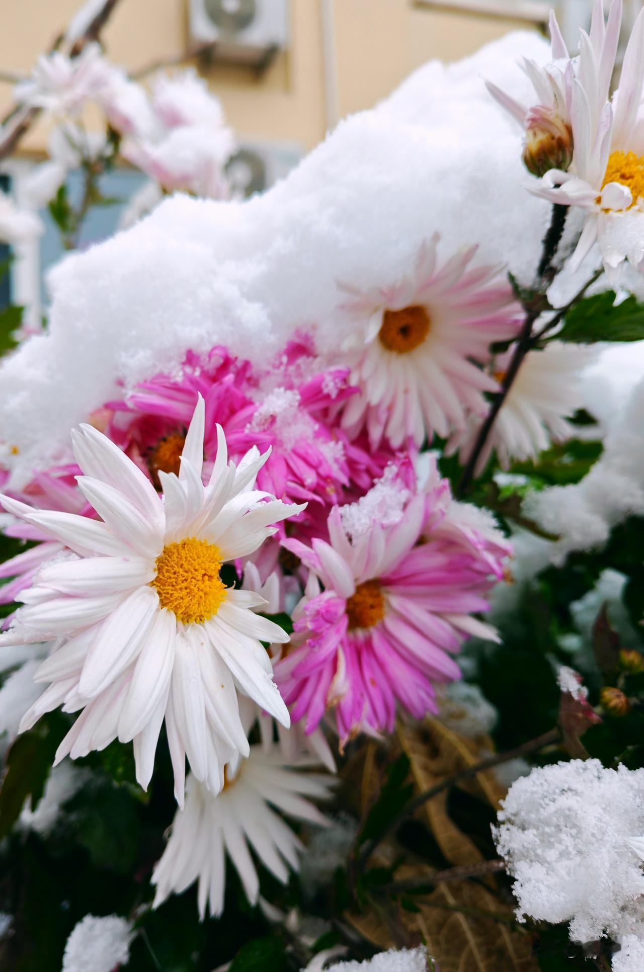 冬日生活打卡季 粉嫩花朵上覆盖着白雪,宛如童话中的梦幻场景。