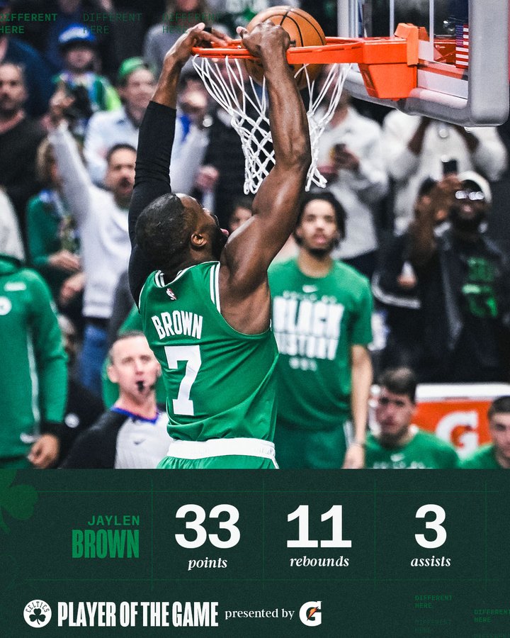 “当选月最佳球员是有原因的!今天砍下两双的杰伦-布朗当选为本场最佳球员!”凯尔特人官方附文道。