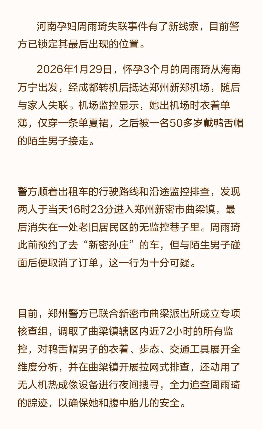 河南孕妇失联事件新线索 警方锁定其最后 河南孕妇周雨琦从郑州失联,警方锁定其最后出现位置。监控显示她与一名陌生男子在新密市曲梁镇消失,警方已展开全面搜寻,确保她和腹中胎儿安全。