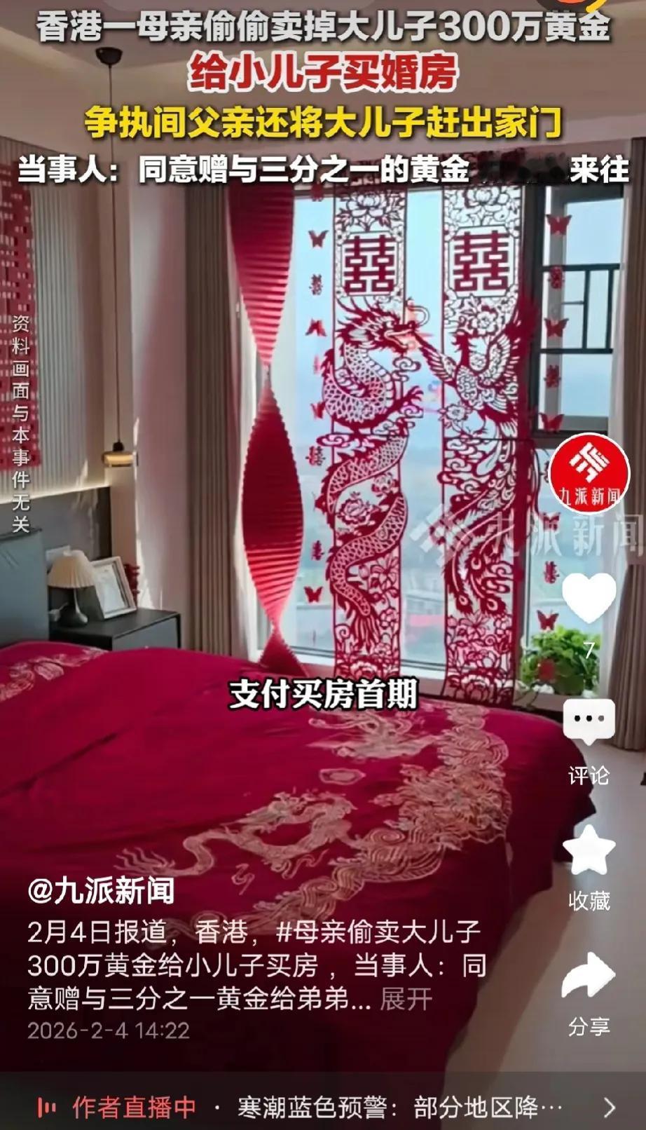 亲生的吗?香港,男子存了300万港元的黄金不翼而飞,他刚想报警,母亲瞬间慌了,赶紧承认是她卖了,想给小儿子买房,男子怒了,跟母亲大吵一架,没想到,父亲不但不帮他,还把他赶出家门。男子找弟弟理论,弟弟表示会还钱,但需要协商,男子心灰意冷,最后做出一个决定。 男子被父亲赶出了家门,他落寞地坐在门口,心烦意乱,他怎么也没想到父母会这么对他,他甚至怀疑,自己是不是亲生的。 原来,男子的弟弟买新房了,男子真替弟弟高兴,他想到如果自己也在弟弟新房附近买套房,以后两兄弟相互就有照应了。 男子手里有一些黄金,那是他多年存下来的,是他全部的积蓄,最近金价大涨,他想把黄金全部卖了,再去看房。 那天,他回到家后满心欢喜地打开保险柜,可映入他眼帘的是,保险柜里空空如也。 男子吓坏了,赶紧大喊:“妈妈,我们家进贼了吗,我的黄金呢?” 男子的妈妈支支吾吾,欲言又止,慌乱中男子掏出手机想要报警,男子妈妈赶忙冲过去摁住他的手说,别报警,黄金我全卖掉了。 男子听完不可置信地看着母亲问道:“卖了?你卖了多少钱,我怎么不知道。” 接着男子母亲跟他哭诉说,你弟弟准备结婚了,可没有婚房,女方父母要求有房子才答应女儿嫁过来,我和你爸爸实在没办法才卖掉你的黄金。 母亲还说黄金只卖了300万港元,房子首付都不够。 男子听了觉得很不可思议,那是他的黄金,可父母却一声不吭就卖掉了,哪怕跟他说一声他都没那么生气。 男子跟母亲大吵一架,他是那么信任父母才把保险柜密码告诉他们,结果他们却做出让他无法接受的事。 男子父亲听了从房间里冲出来,指责男子没格局,没有当大哥的样,还说,做大哥的就应该关照弟弟,弟弟有需要时难道不应该帮一下吗? 男子不服跟父亲理论,结果被父亲赶出了家门,于是有了开头那一幕。 男子越想越觉得难过,既然父母没法理解,弟弟应该理解他的心情,所以他找到弟弟。 没想到弟弟的做法更让他心寒,弟弟说,我可以还给你,但至于还多少,后面我们再商商量。 看看弟弟一副拿钱理所应当的样子,男子觉得兄弟情也是到尽头了。 心灰意冷的男子索性从家里搬了出去,思虑许久后,他只对弟弟提了一个要求:两个月内还清三分之二的钱款,至于剩下的三分之一,权当是买断了他们这一场早已变味的兄弟情。 从情理来说,父母的做法既越界又伤情,私自变卖儿子的积蓄,无视其多年努力和个人权益,还以“长兄应让弟”的道德绑架逼迫孩子,一碗水端不平,寒了长子的真心。 男子的愤怒与委屈合情合理,他并非不愿帮衬,而是无法接受至亲的不告而取和理所应当。 弟弟的敷衍推诿更显凉薄,将兄长的损失视作可协商的小事,丝毫未顾及手足情分。 男子最终的决定,是失望后的无奈取舍,用三分之一钱款买断亲情,看似决绝,实则是被至亲的偏心与冷漠逼到了绝境,情理之中的寒心选择。 有人说,哪有一碗水端平的父母,哥哥委屈 ,一直被偏爱的弟弟也是感觉委屈,他会认为我是弟弟啊 我比你穷啊!哪个被偏爱的不会有感恩的心的。 还有人说,父母再偏心也不能偷大儿子的钱呐 ,这是犯法,不是家法,弟弟给断起网来了,那更要走法律了,既然弟弟也知情,那同犯。 依据香港法例第210章《盗窃罪条例》第2(1)条,任何人不诚实地挪占属于另一人的财产,意图永久地剥夺该另一人的财产,即属犯盗窃罪,循公诉程序定罪后,可处监禁10年 。 本案中,黄金是男子个人积蓄,母亲未经其同意,用已知密码打开保险柜变卖黄金给小儿子买房,属于不诚实地挪占他人财产,且具有永久剥夺男子财产的意图,已符合该条款下盗窃罪的构成要件。 父亲的偏袒与弟弟的知情接受、敷衍协商,不影响母亲盗窃罪的成立,即便事后协商还款,也仅能作为量刑时的求情因素,不改变刑事定性,父母不能以亲情为借口规避法律责任,弟弟若知情并获益,还可能涉及处理赃物相关犯罪。 对此,你们怎么看?