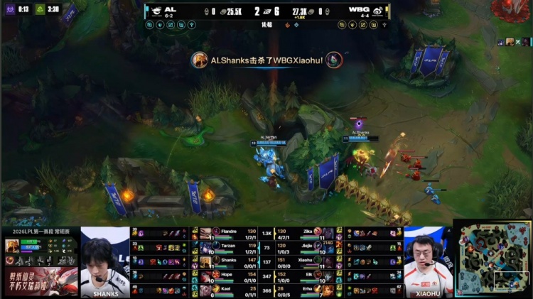 [21:02]下河道团战,xiaohu阿卡丽被王杰女枪扫残送Flandre冥犬人头,WBG下路放出先锋撞掉AL二塔,WBG经济领先6k。