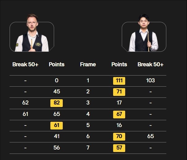 开场后袁思俊先赢两局,第三局特鲁姆普打出单杆62分扳回一局,第四局袁思俊实现单局逆转,休息回来双方各胜一局袁思俊率先拿到赛点,第七局袁思俊清台超一分完成逆转。