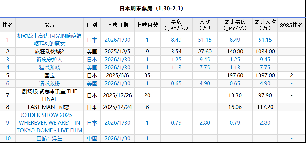 日本周末票房(1.30-2.1):1.《机动战士高达 闪光的哈萨维 喀耳刻的魔女》开画夺冠;2.《疯狂动物城2》累计票房140.8亿日元,排名日本影史第21;3.《国宝》累计票房197.6亿日元,超越《哈尔的移动城堡》排名日本影史第10;4. 中国动画《白蛇:浮生》公映上榜。(数据来源:kogyotsushin、dorama)