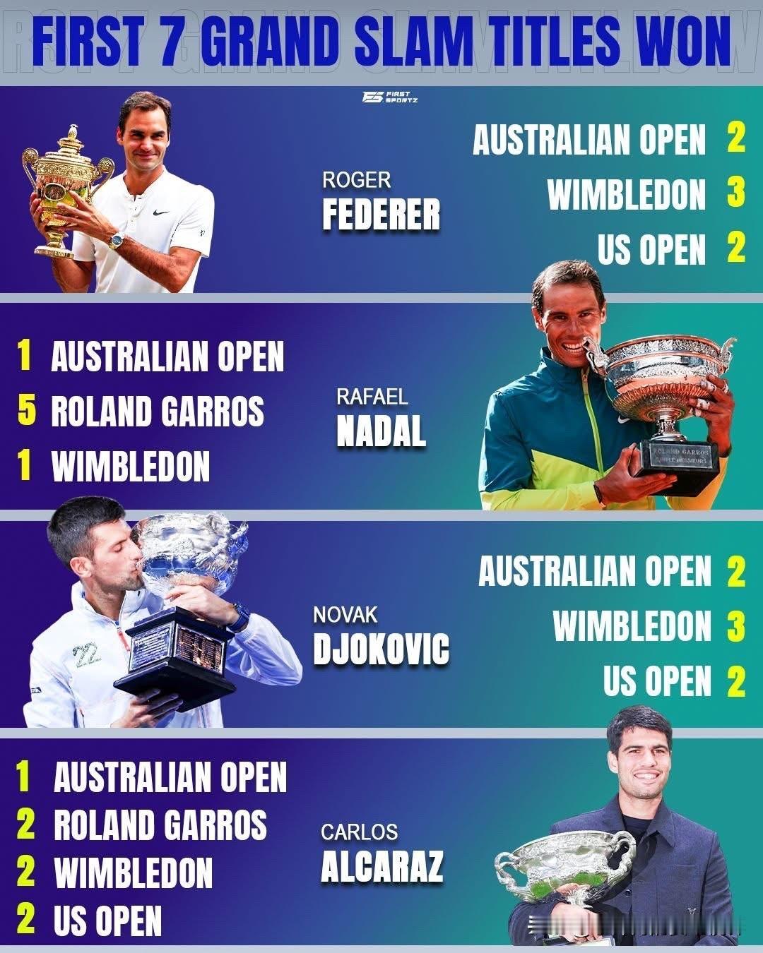 阿尔卡拉斯和三巨头前7个大满贯冠军比较: 罗杰·费德勒: 2个澳网冠军 3个温网