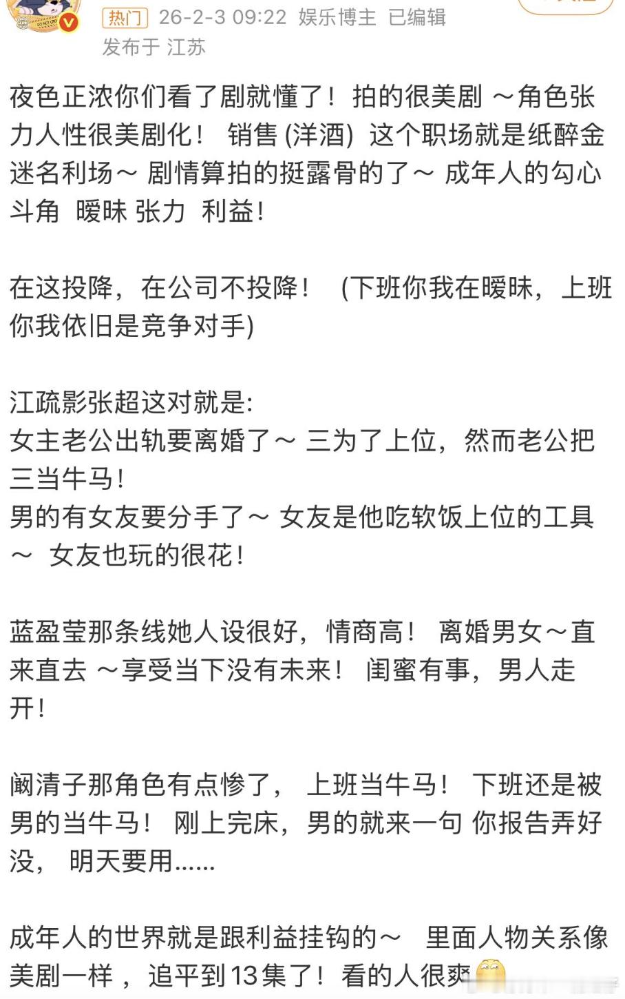 好久没看过品相这么浓的都市剧了被《夜色正浓》狠狠戳中了。原来最好的都市剧,是让你
