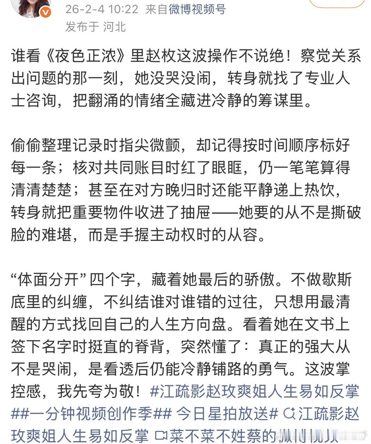 好久没看过品相这么浓的都市剧了被《夜色正浓》狠狠戳中了。原来最好的都市剧,是让你在别人的博弈里看见自己的影子。画面沉得下去,台词准得刺人,唯有完整的自我,才是不可撼动的锚点。 夜色正浓