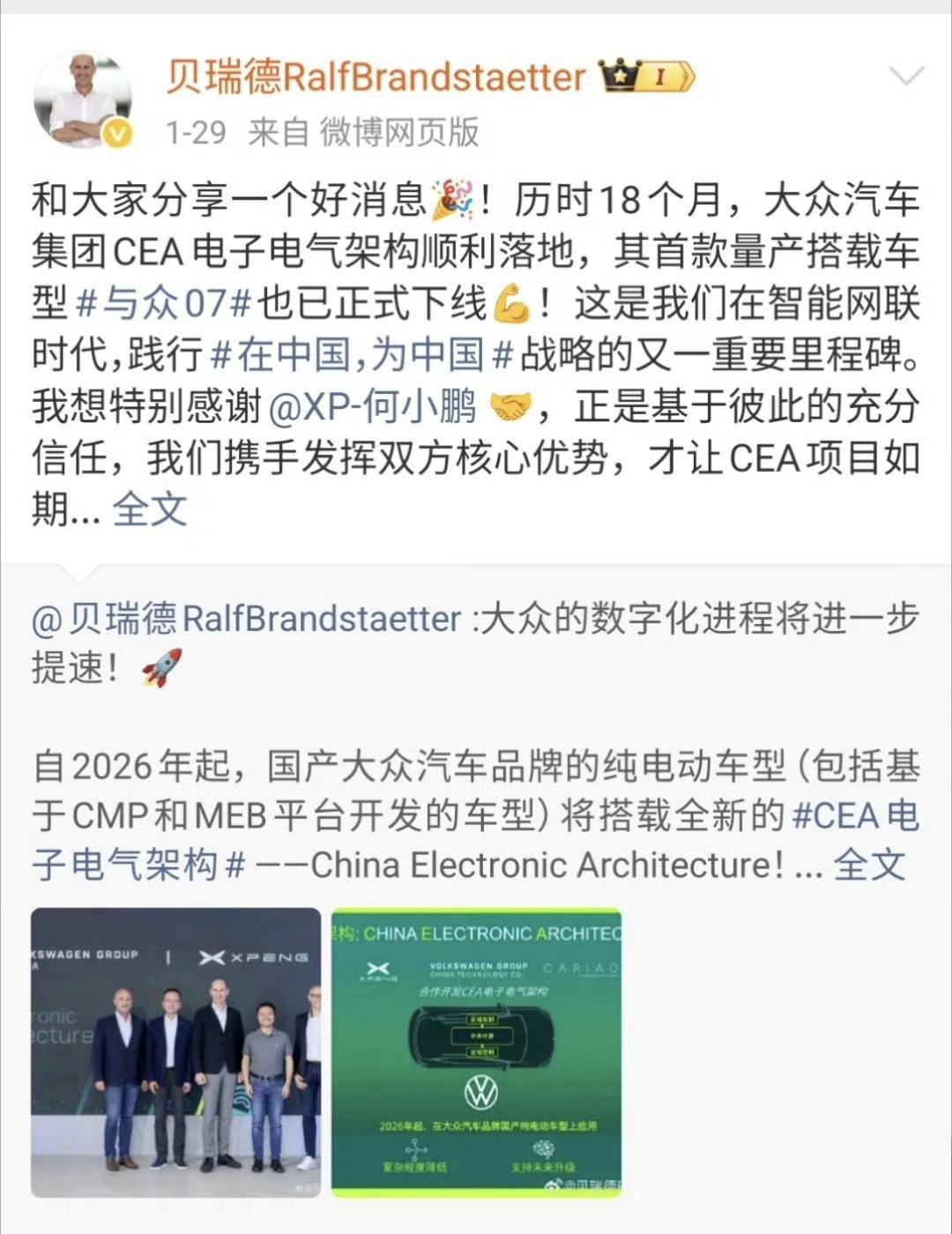 作为资深大众车主,与众06这车我一直好评不断,直到去更新一次充电程序,给我气的。 图1图2图3: 我确实没想到更新快充程序需要去本地4S店更新,而且是很传统的连线从电脑上更新,而且一弄一下午,还没弄好,还得再去一次,我。。。 在我的认知里,更新软件不就是OTA一下,云端处理就行,咋还需要通过硬线接OBD口呢? 不过想了想,可能是充电软件没有OTA功能,可能是电子电气架构不支持,也有可能是硬件上就不支持。 不过大概率是电子电气架构,这也就能解释,为什么大众要跟小鹏一起联合开发CEA电子电气架构,可以支持未来更新,升级等,闭环了。 图4图5: CEA电子电气架构会在2026年开始在大众的车上开始运用,与众运用得等到与众07,兄弟们如果要买到最先进的大众,可能是与众07 那款车。 除了这一点不方便之处,与众06开起来没啥大问题,转弯半径很小很灵活,跟开A0级别车一样方便,底盘也很好,不愧是大众。 这车得赶紧升级换代了,如果以后有智能座舱和智驾了,我还会支持。【来自懂车帝车友圈】