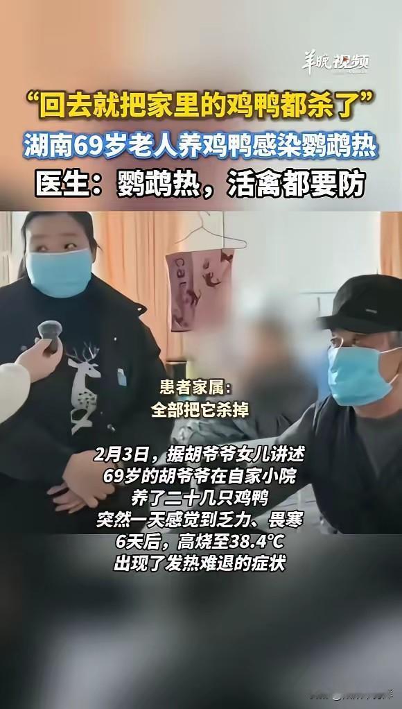 “悲剧还是发生了!”近日,湖南,一老人为了打发时间,在自家小院养了二十几只鸡鸭,结果突然感到乏力畏寒,过了几天后,竟高烧到38.4度,并且迟迟不退烧,去医院检查,才知道老人感染了鹦鹉热,吓得家人把鸡鸭都杀了!网友鸡鸭也会感染鹦鹉热? 这位胡爷爷今年69岁,平时就在村里种种菜、喂喂鸡鸭,日子过得平淡安稳。刚开始发烧那几天,他以为就是普通感冒,自己找了点退烧药吃,没当回事。 直到烧到快40度,咳嗽咳得直不起腰,连饭都吃不下,家人才赶紧把他送进医院。医生一看他有活禽接触史,再结合最近科室刚收过两例鹦鹉热病人,立刻安排了检查。 结果出来时,所有人都懵了。胡爷爷的肺部已经出现感染,确诊是鹦鹉热衣原体感染。医生说再晚来两天,可能就发展成重症肺炎了。 女儿在病房外听完诊断,当场就哭了。她怎么也想不到,父亲养了一辈子的鸡鸭,竟然会招来这种病。回家第一件事,就是把小院里二十几只鸡鸭全部处理掉,连喂鸡的食盆都用消毒液泡了一下午。 这事传到网上,大家都炸开了锅。有人说“太吓人了,以后再也不敢碰活禽了”,也有人质疑“鹦鹉热不是鹦鹉才会带的吗?怎么鸡鸭也能传染?” 我想起去年过年,我爸从乡下带了一只土鸡回来杀。我妈当时就念叨,处理活禽一定要戴手套、勤洗手。现在看来,这真不是小题大做。 很多人不知道,鹦鹉热衣原体藏在鸟类、家禽的粪便和羽毛里,不光鹦鹉、鸽子会带,家里养的鸡鸭鹅都可能成为传染源。老人、小孩和免疫力差的人,只要接触到带菌的分泌物,就可能被感染。 更让人揪心的是,这种病初期症状和感冒几乎一模一样,很容易被误诊。胡爷爷就是因为拖了六天,才差点酿成大祸。 医生提醒,春节前后是活禽交易的高峰期,也是鹦鹉热的高发期。接触活禽后一定要用肥皂洗手,不要用手摸眼睛、鼻子。如果出现持续高烧、剧烈咳嗽,赶紧去医院,别硬扛。 胡爷爷现在已经出院了,只是还得在家休养一段时间。他说以后再也不养鸡鸭了,“命比什么都重要”。 这事给所有人提了个醒,看似安全的日常习惯,可能藏着致命风险。 你家过年会买活禽吗?知道怎么预防鹦鹉热吗?欢迎在评论区聊聊你的看法! 信息来源:《“回去就把家里的鸡鸭都杀了”,湖南69岁老人养鸡鸭感染鹦鹉热,医生:鹦鹉热,活禽都要防。》羊城晚报•羊城派