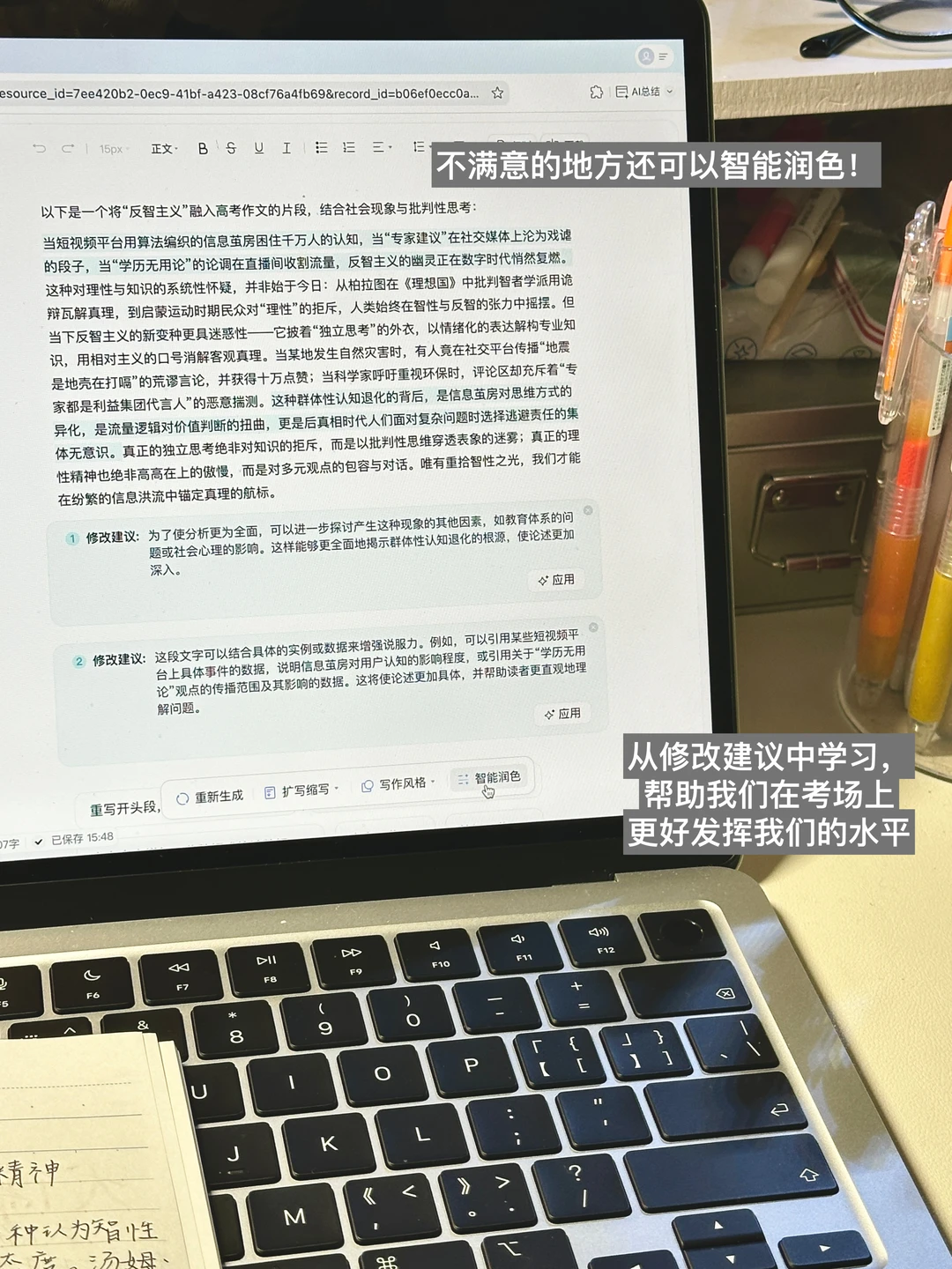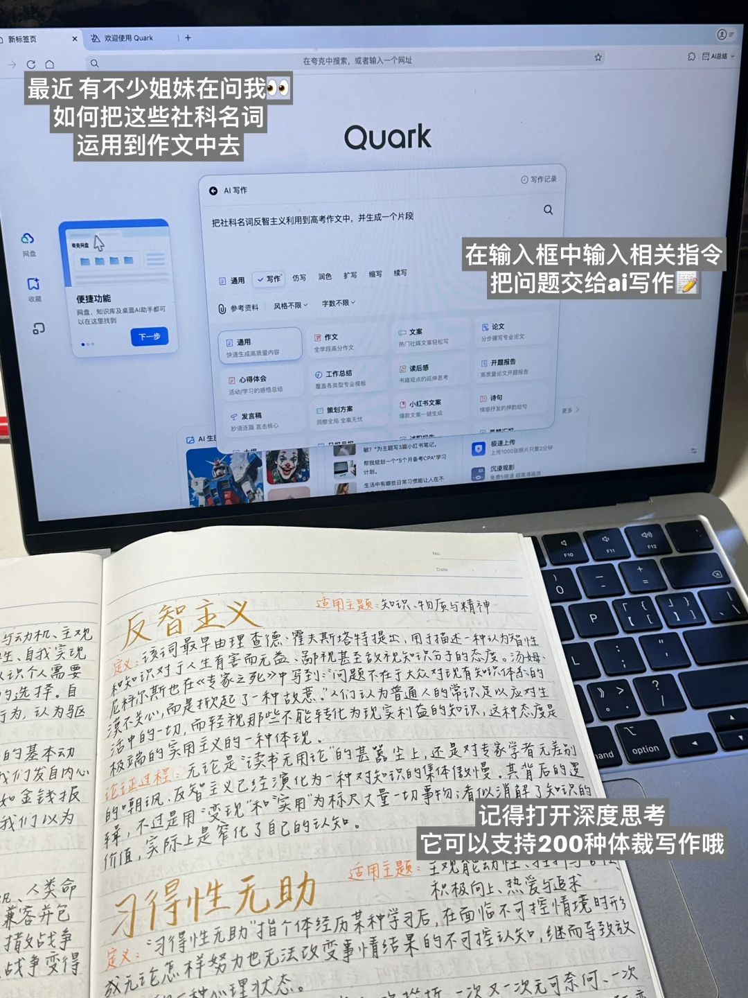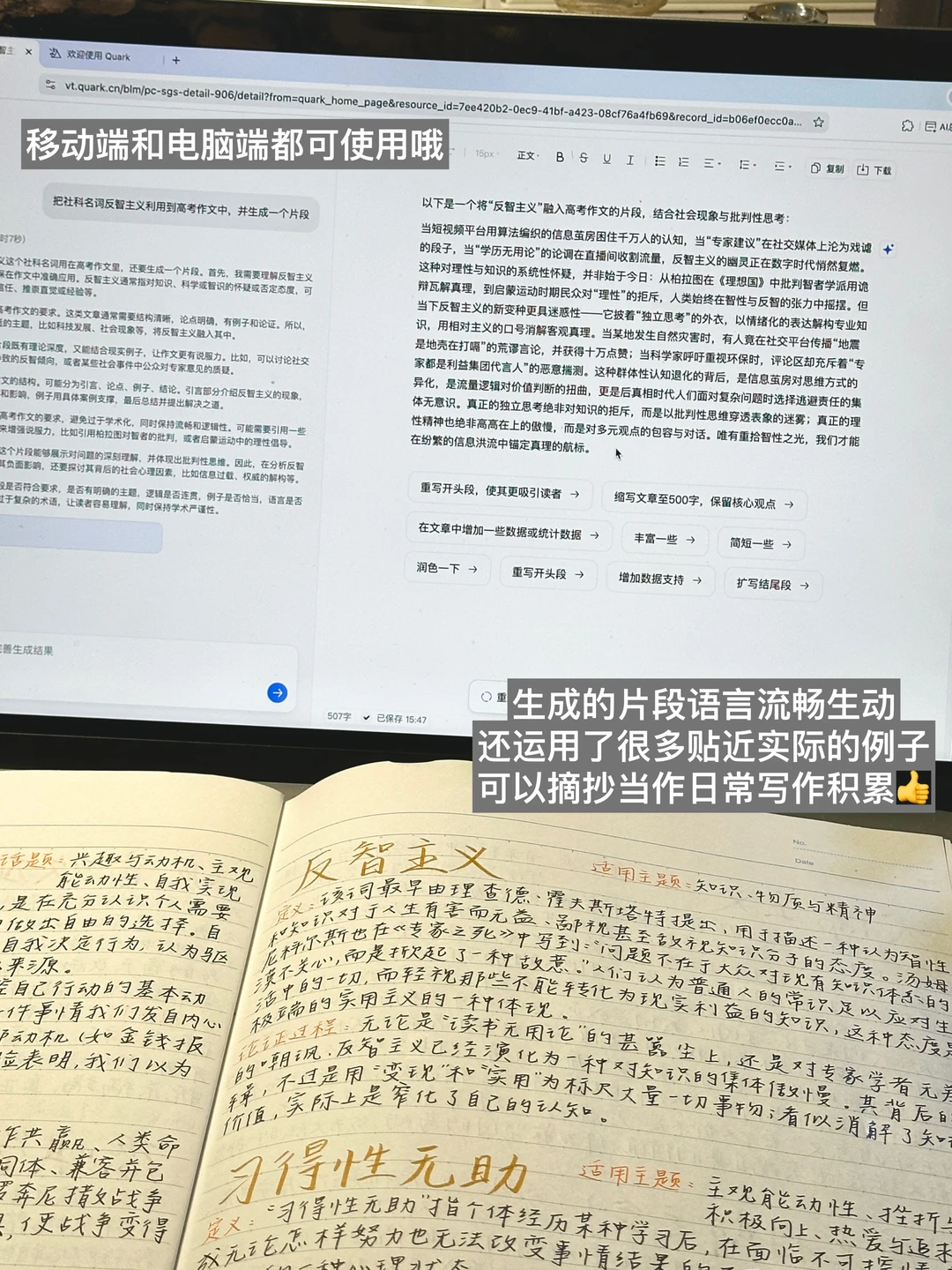 _ hello大家! 本期的写作素材积累又来了,注意查收! 除了平时的素材来自于📄,有时我也会利用夸克的ai写作来润色素材,让内容更加丰富,论证效果更强,主打一个精益求精![偷笑R] 它也具备了深度思考的能力,每次生出的片段都有令我眼前一亮的程度。 在日常素材积累的过程中,大家如果找到了一些好词,但不知道如何运用时,我觉得不妨依靠一下ai写作,可以从中获取灵感和素材,让我们的作文素材库更加精彩![喝奶茶R]