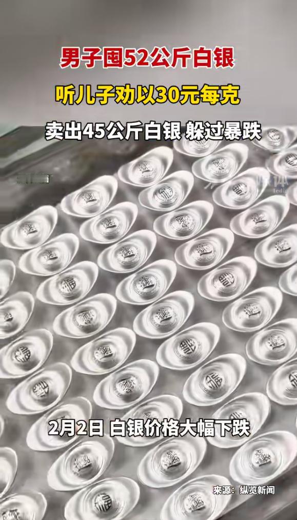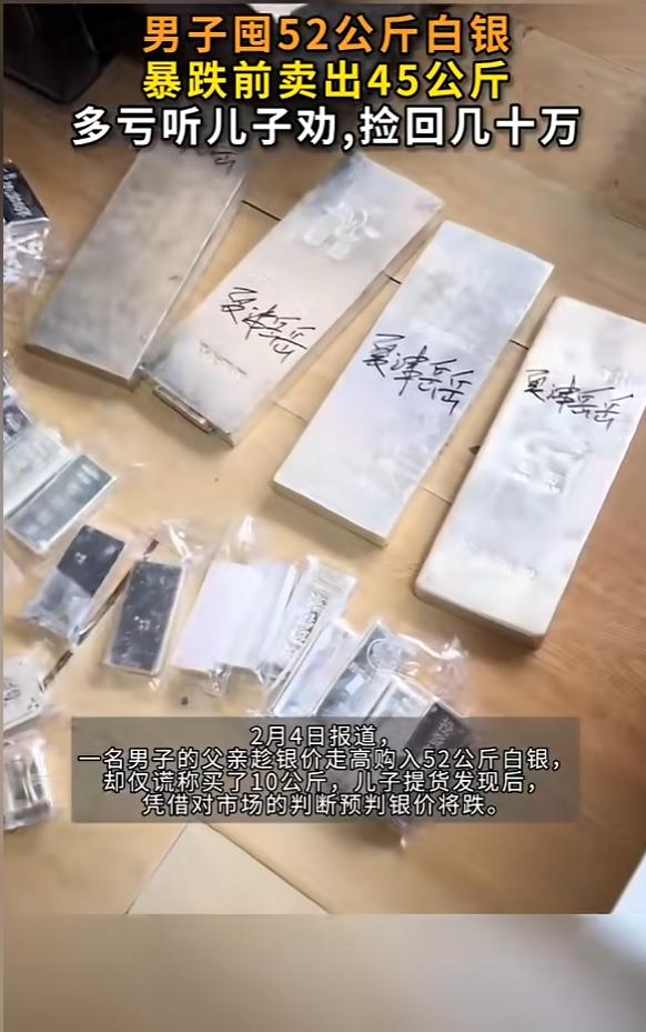 “这就是命啊!”近日,一男子见白银价格上涨,便买了52公斤白银,还对家人谎称只买了10公斤,好在儿子发现,天天劝他卖掉,最后男子卖掉了45公斤,没想到男子刚卖出去,白银就开始暴跌,他也成为此次囤白银的幸运儿。网友:这儿子没白养!   最近白银市场闹得沸沸扬扬,有人跟风囤货亏得直跺脚,有人却凭着儿子的劝说,幸运躲过一场暴跌,成了全网羡慕的对象。   事情得从上个月说起,1月26号那天,一位老爷子看着白银价格一路飙升,越看越动心,琢磨着趁涨价赚一笔,干脆一口气买了52公斤白银。   可他心里也没底,怕家里人反对自己冒这么大风险,就故意瞒了下来,跟家人谎称只买了10公斤,想着赚了钱再说实话,亏了也能少点埋怨。   没成想,1月28号去提白银现货的时候,老爷子的谎话直接露馅了,儿子一眼就发现不对劲,仔细一问才知道,父亲居然偷偷买了52公斤,这么大的量,要是价格跌了,损失可不小。   儿子平时也关注过白银行情,知道这阵子银价涨得太猛,已经到了高位,心里隐隐发慌,觉得迟早会跌。   从那天起,儿子就天天在老爷子耳边念叨,劝他赶紧卖掉一部分,别贪多,见好就收。   一开始老爷子还舍不得,觉得银价还能再涨,不想错过赚钱的机会,可架不住儿子天天劝说,软磨硬泡之下,也慢慢动摇了,觉得儿子说得有几分道理,没必要赌太大。   最后老爷子咬了咬牙,以每克30元的价格,卖掉了45公斤白银,只留下7公斤,想着就算跌了,损失也能可控。   谁都没料到,就在他卖完没两天,2月2号开始,白银价格突然迎来暴跌,国内现货价从30元/克一路往下掉,最低的时候跌到了十几块,不少跟风囤货的人都亏惨了,而老爷子因为提前卖了大部分,成功躲过了这场亏空。   这事传开后,网友们都炸开了锅,纷纷说“这儿子没白养”,要是没有儿子天天劝说,老爷子大概率会抱着52公斤白银等到暴跌,到时候亏的可不是一笔小数目。   其实仔细想想,老爷子的心态,就是很多普通人跟风投资的缩影,看见别人赚钱,就忍不住跟风,想着赚快钱,却忽略了市场的风险。   最近这阵子,白银价格涨得确实厉害,一方面是地缘政治冲突让大家都想靠贵金属避险,另一方面光伏、新能源汽车这些行业对白银的需求越来越大,供需缺口让银价一路走高。   可白银市场规模小,波动本来就比黄金大,之前也有过单日暴跌十几%的情况,普通人盲目囤货,根本摸不准行情的拐点。   老爷子算是幸运的,有个理性的儿子及时拉了他一把,没有贪最后一个铜板。   要是他当初不听劝,抱着侥幸心理继续持有,现在大概率会后悔不已。   其实投资这回事,从来都没有稳赚不赔的,尤其是普通人,别想着靠跟风囤贵金属发大财,守住自己的本金,理性看待涨跌,才是最稳妥的。   有人说老爷子卖早了,说不定以后银价还会涨回来,但在我看来,见好就收从来都不是吃亏,尤其是这种波动极大的市场,能及时锁定利润,躲过暴跌,就已经是赢家了。   毕竟对普通人来说,能避开风险,比冒险赚那点不确定的利润,要实在得多。   对此您有什么不同的看法,可以在评论区留言讨论!!!   信息来源:《男子囤52公斤白银,听儿子劝以30元每克卖出45公斤躲过暴跌。》长城新媒体