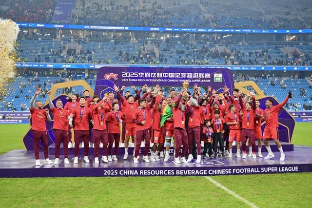 2025年11月22日,上海海港队在颁奖仪式上庆祝夺冠。当日,在辽宁大连举行的2025赛季中国足球协会超级联赛第30轮比赛中,上海海港队客场1比0战胜大连英博海发队,获得本赛季中超联赛冠军。新华社记者吴青昊摄