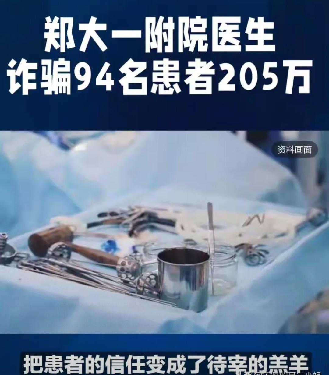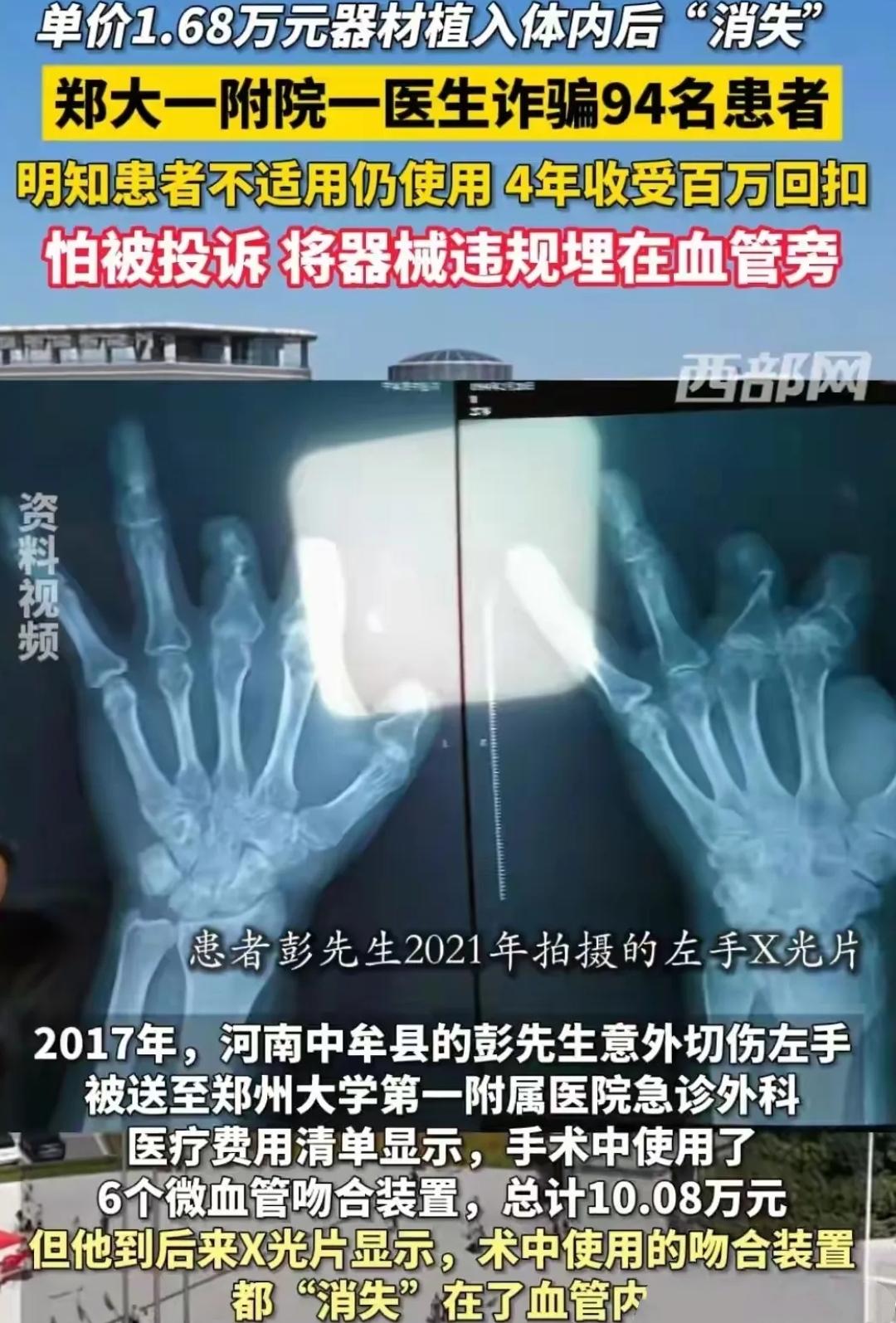 真是不查不知道 一查吓一跳! 去医院做个手术 身体里竟然被医生凭空“安”了根本不存在的高价零件。 郑大一附院的王福建医生,这胆子也太大了。有个木工师傅手受伤去急诊,单子上写着用了两个“微血管吻合装置”,花了33600元。 结果咋样?三年后回老家拍片子一看,骨头还在,那几万块的装置压根就没有! 这可不是个例,有个花10万买了6个装置的患者,体内也是空空如也。就连12岁的孩子也不放过,虚报1.68万的材料费。 被发现了咋办?这医生竟然私下联系退钱想封口。 我就纳闷了,明明一千多块就能缝好的血管,非要虚构一万六的“神器”。四年骗了94个人,捞了200多万。 这哪里是治病救人,分明是趁火打劫。 各位读者怎么看?欢迎评论区留言。医大一骨科医生