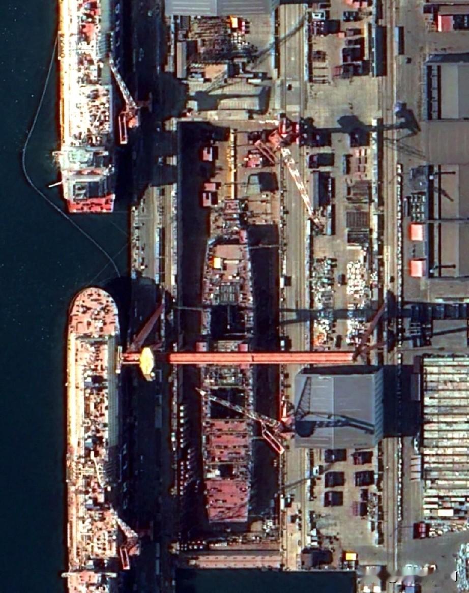 舰艉合拢进度刷新记录 舰艉分段已全部合拢,再建就顶到干船坞闸门了,现在龙门吊