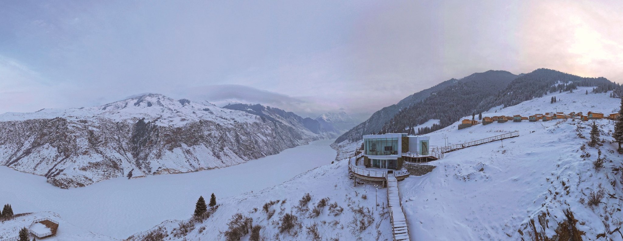 昭苏玉湖蓝冰雪山与玻璃建筑构成视觉奇观
