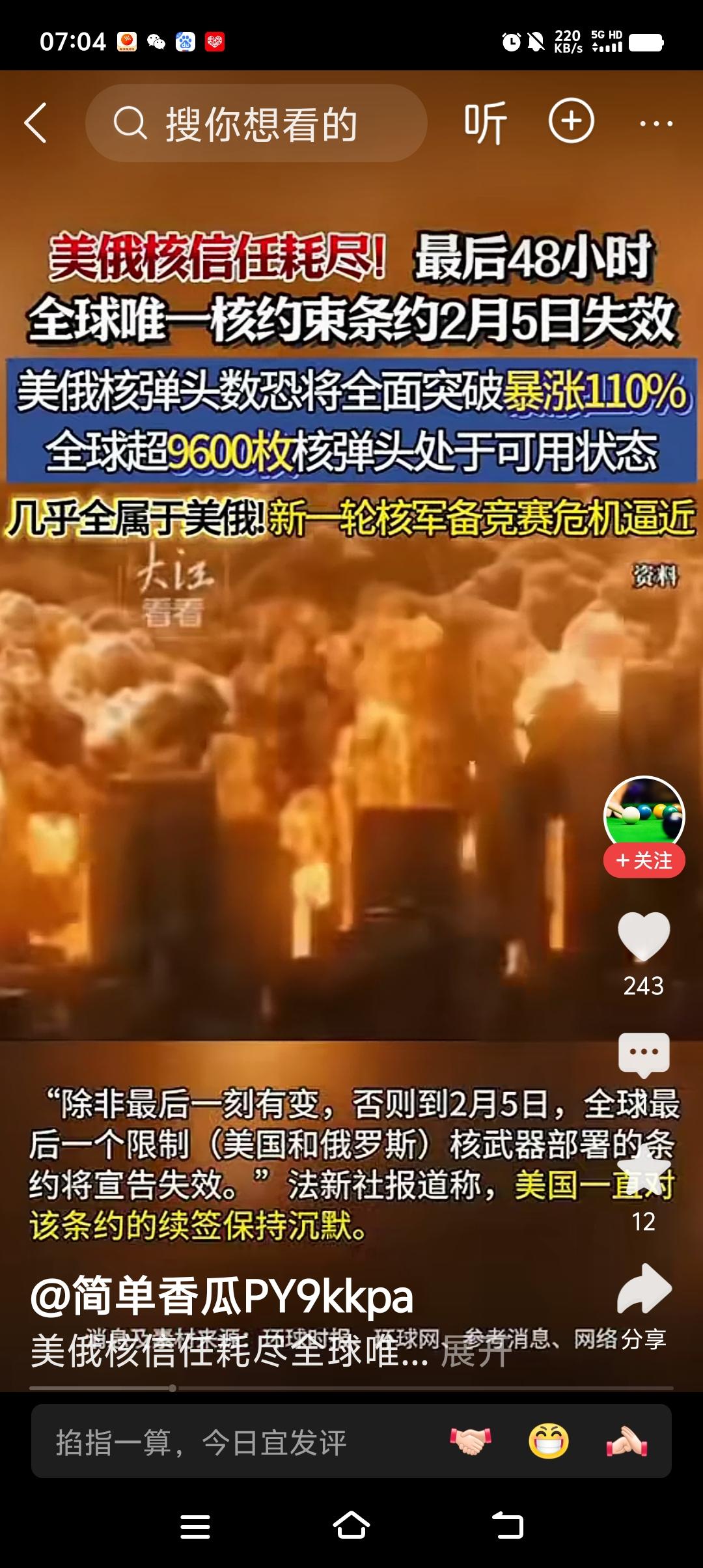 全球核约束崩塌:《新削减战略武器条约》失效的安全冲击与秩序重构 2026年2月5日,美俄《新削减战略武器条约》正式失效,这是继《中导条约》《开放天空条约》之后,全球核军控体系崩塌的最后一块拼图。作为美俄间唯一具有法律约束力的核约束条约,其失效标志着冷战后建立的战略稳定框架彻底瓦解,全球安全进入无规则、高风险的“核失控”时代,对大国关系、地区稳定与全球治理产生颠覆性冲击。 一、条约失效的现实背景:美俄博弈与军控体系坍塌 《新削减战略武器条约》2011年生效,2021年延至2026年2月5日,核心条款限制美俄部署核弹头不超过1550枚、洲际导弹与战略轰炸机等运载工具不超过800件,同时建立数据交换、现场核查、发射通报等透明机制,是全球核安全的“压舱石”。2025年9月,俄方提议延长条约核心限制一年,未获美方实质性回应;2026年2月4日,俄方宣布不再受条约任何义务约束,双方进入“无约束核自由”状态。 条约失效的根源在于美俄战略对抗升级。美国将大国竞争作为核心战略,追求核力量绝对优势,推动“三位一体”核力量现代化,研发低当量核武器,试图打破“相互确保摧毁”平衡;俄罗斯则以核力量为安全底线,面对北约东扩与制裁压力,强化核威慑实战化,拒绝接受不对等约束。双方在军控问题上的零和博弈,叠加欧洲、亚太地缘冲突外溢,最终导致条约“无疾而终”,全球核军控体系陷入30年来最严重危机。 二、直接冲击:美俄核竞赛重启与误判风险飙升 条约失效首先引发美俄核军备竞赛全面升级。失去数量上限后,双方可自由扩充核武库,美国或加速部署新型洲际导弹、战略核潜艇,推进“核常一体”作战体系;俄罗斯则可能恢复苏联时期核武规模,强化高超音速核载具研发,形成“以质补量”的威慑优势。据斯德哥尔摩国际和平研究所数据,美俄手握全球90%以上核弹头,若竞赛失控,双方部署弹头数量可能在5年内突破2000枚,重回冷战高峰期水平,巨额军费投入将挤压民生与发展资源,加剧全球经济负担。 更致命的是,核查与透明机制清零导致战略误判风险陡增。条约规定的18次年度现场核查、数据定期交换、导弹发射提前通报等机制,是避免“擦枪走火”的核心保障。失效后,双方只能依赖卫星侦察、情报监听等间接手段判断对方动向,在信息不透明下易陷入“最坏情况假设”——一次常规导弹试射、一场军事演习,都可能被解读为核攻击前兆,触发应急核反击程序。2023年美俄曾因无人机事件险些引发直接冲突,失去核约束后,此类摩擦升级为核危机的概率呈指数级上升,全球进入“核误判高危期”。 三、外溢效应:全球核扩散失控与地区安全碎片化 条约失效冲击《不扩散核武器条约》(NPT)根基,全球核扩散风险全面抬头。NPT以核大国裁军为核心承诺,换取无核国家放弃核研发,美俄率先打破约束,直接削弱其合法性。无核国家对“核保护伞”信心崩塌,中东、亚太或现“核跟风”:伊朗或加速突破铀浓缩上限,沙特、土耳其等推动民用核项目军事化;朝鲜将强化核试验与导弹研发,东北亚核僵局持续恶化。 地区安全格局随之碎片化,欧洲与亚太首当其冲。欧洲方面,北约或推动“共同核力量”建设,德、波等国或重新考虑部署美核武器,俄罗斯以加里宁格勒核部署反制,欧洲重回“核前沿”,俄乌冲突外溢风险加剧。亚太方面,美国借机强化“延伸威慑”,推动美日、美韩核共享,鼓动盟友扩军,引发地区反制,南海、台海等热点问题“核化”风险显著上升。 四、全球治理危机:多边机制失灵与安全秩序重构 核军控体系崩塌引发全球治理连锁失灵,联合国、安理会等多边机制难以发挥约束作用。美俄对抗导致安理会决策瘫痪,国际原子能机构失去美俄核活动核查权限,核材料流动监控失效,核恐怖主义风险上升。全球战略稳定从“规则约束”转向“实力对抗”,中小国家被迫选边站队,多极化进程受阻,世界重回大国博弈主导安全的旧秩序。 但危机中也蕴含重构契机。条约失效倒逼国际社会反思现有体系缺陷,推动构建更包容均衡的核治理框架。中法等国可发挥协调作用,推动美俄重启对话,吸纳新兴大国参与,建立区域核对话机制,以双边信任措施弥补多边漏洞。同时,需将核军控与人工智能、高超音速等新兴技术管控结合,形成“传统+新兴”的复合安全治理模式。 综上所述,《新削减战略武器条约》失效是全球安全的“分水岭”,标志冷战后核稳定秩序终结,开启“无约束核竞争”时代。美俄作为核大国,重启军控对话、重建约束机制,是避免核灾难的唯一路径。国际社会需摒弃零和思维,推动核军控从“美俄双边主导”转向“全球共同治理”,以多边合作对冲大国对抗,守住“不发生核战争”底线,守护人类和平发展的未来。
