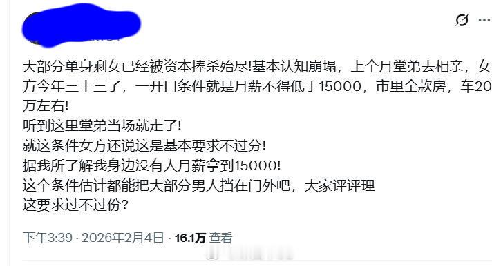 相亲,女方今年三十三了,一开口条件就是月薪不得低于15000,市里全款房,车20万左右!要求过不过份?这不是过份不过份,问题在于对方就是把自己当成商品,而且是溢价商品,让你高价钱买这个商品。当今社会婚姻成为一些女性摆脱贫困或是个人资产增值的一个大工具,很多女性就高价捂盘惜售,结果最后在货架上面过期了。