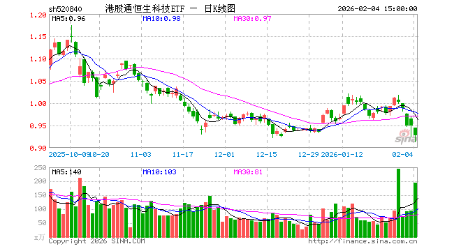 2月4日,港股通恒生科技ETF(520840)跌2.42%,成交额1.82亿元。当日份额增加9600.00万份,最新份额为11.36亿份,近20个交易日份额减少2250.00万份。最新资产净值计算值为10.48亿元。