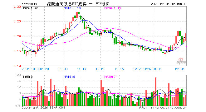 2月4日,港股通高股息ETF嘉实(513830)涨1.51%,成交额816.88万元。当日份额减少200.00万份,最新份额为1.12亿份,近20个交易日份额减少1150.00万份。最新资产净值计算值为1.36亿元。