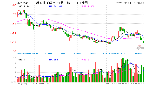 2月4日,港股通互联网ETF易方达(513040)跌2.32%,成交额8.56亿元。当日份额增加1.41亿份,最新份额为70.23亿份,近20个交易日份额增加9.63亿份。最新资产净值计算值为96.81亿元。