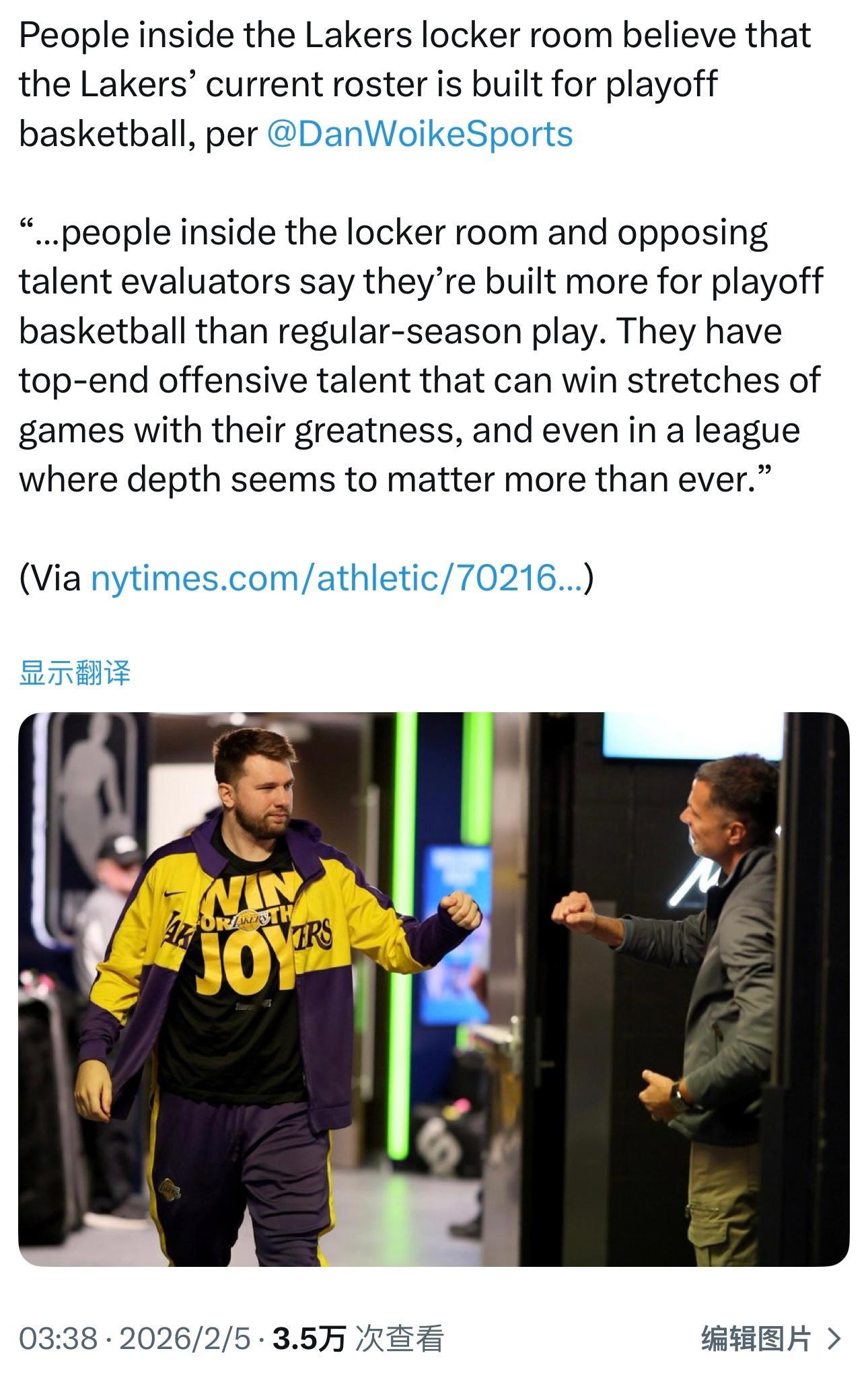 湖记Dan Woike:湖人更衣室内部人士认为,球队目前的阵容是为季后赛打造的。