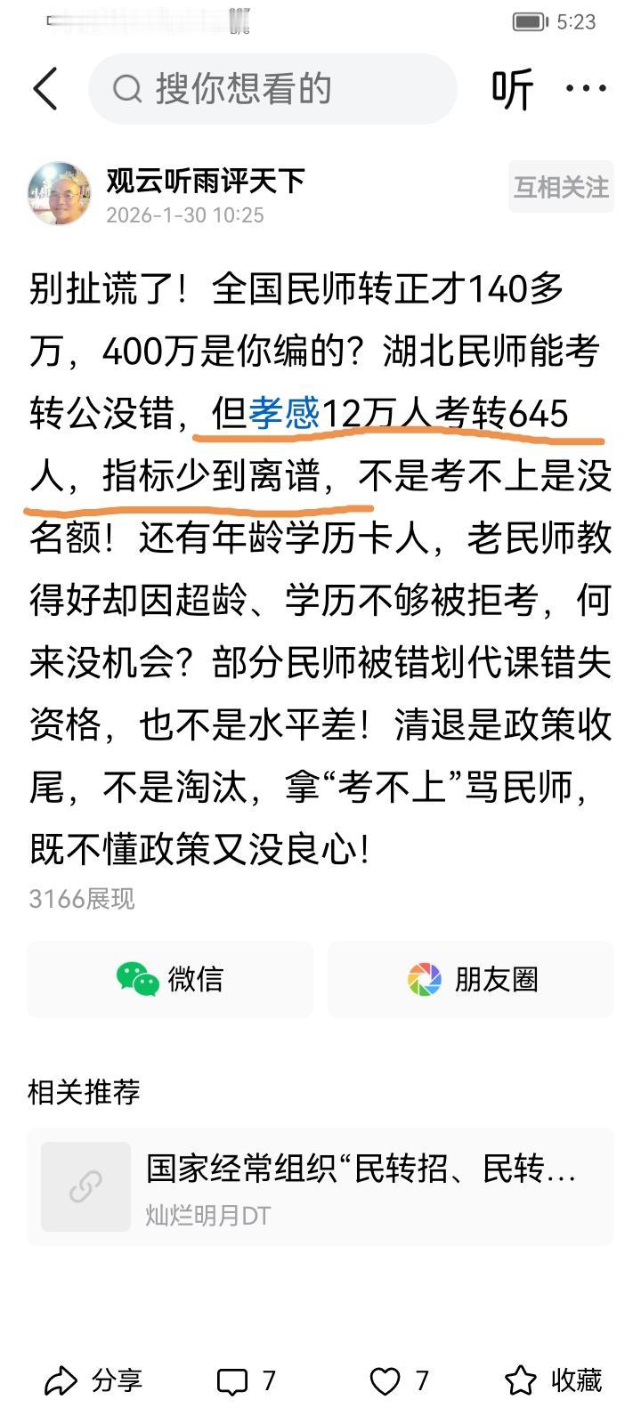 被教育部门辞退的观云听雨评天下老民代教师你好! 其实你俩发贴各有“特长”,你是无限度夸大民办教师数量。把湖北省孝感市民办教师一次考转正数量编成有12万,你根本就没有考虑当时孝感市有多少人口,当然这样就能使“分母”无限扩大,造成转正率下降,使被辞退者比率增加,不过你同样是上嘴唇挨着天下嘴唇挨着地的胡说八道!