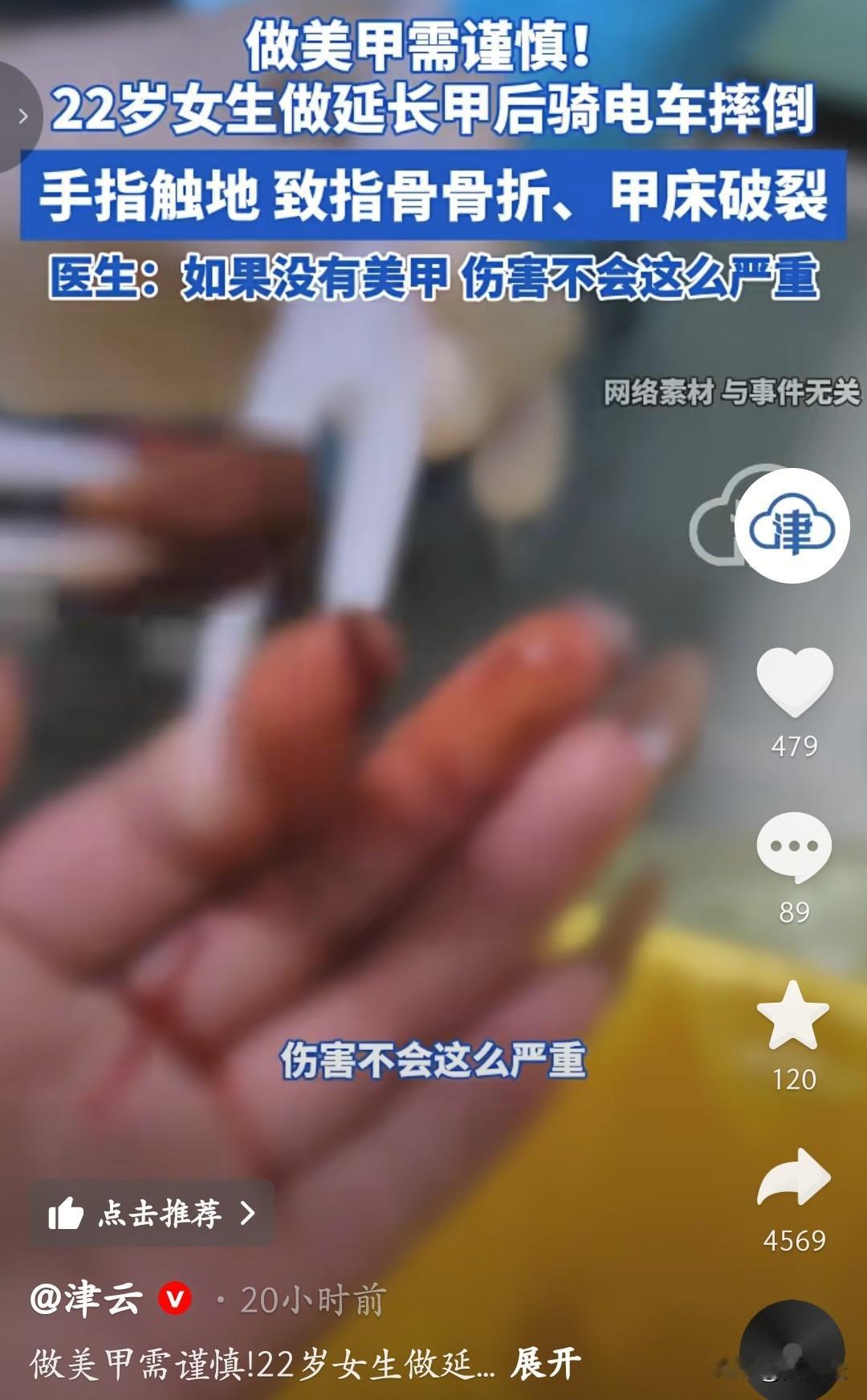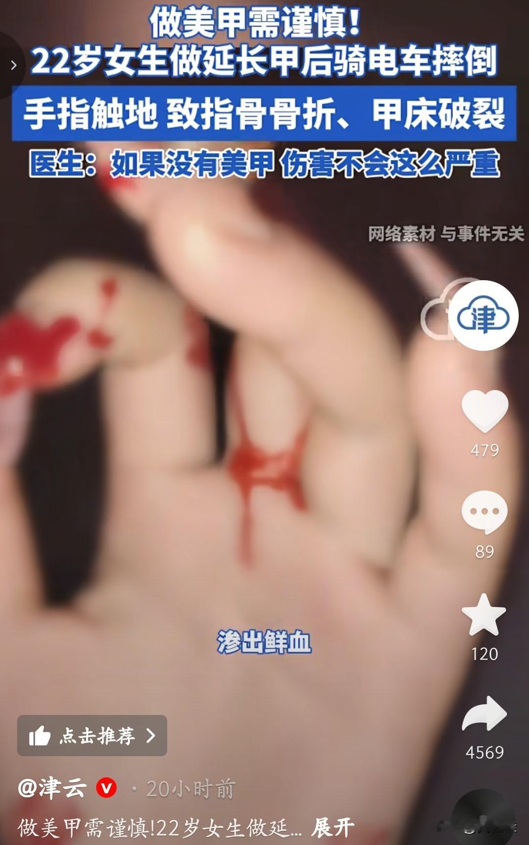 看得头皮发麻!做美甲竟让22岁女生摔成骨折! 这画面看着都疼!一位22岁女生做了延长甲后骑电车摔倒,手指触地的瞬间,延长甲直接受力,导致指骨骨折、甲床破裂,鲜血直流。 医生明确表示,如果没有这副延长甲,摔倒时的伤害根本不会这么严重。美甲本是为了好看,没想到却成了“伤人利器”。 其实这种情况并非个例,延长甲会改变手指的受力方式,一旦摔倒或碰撞,很容易让指甲和甲床承受额外的冲击力,甚至引发更严重的损伤。爱美的同时,真的要考虑安全问题,尤其是经常骑车、从事体力活动的人,尽量避免做过长的美甲。