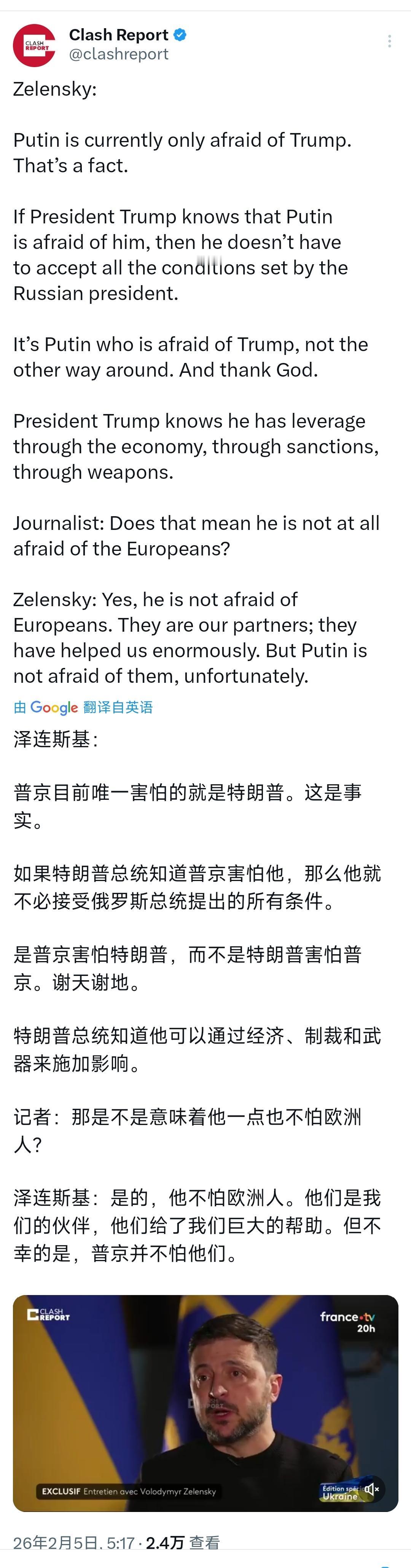 乌克兰总统泽连斯基今天(北京时间2月5日)接受采访时表示:“普京目前唯一害怕的就是特朗普。这是事实。如果特朗普总统知道普京害怕他,那么他就不必接受俄罗斯总统提出的所有条件。是普京害怕特朗普,而不是特朗普害怕普京。谢天谢地。特朗普总统知道他可以通过经济,制裁和武器来施加影响。” 记者追问道:那是不是意味着他一点也不怕欧洲人?泽连斯基表示:“是的,他不怕欧洲人。他们是我们的伙伴,他们给了我们巨大的帮助。但不幸的是,普京并不怕他们。” [机智]评几句:泽连斯基刻意捧高特朗普、贬低欧洲的表态,分明是精心给特朗普设下政治圈套,表面极尽吹捧称普京只惧怕特朗普,实则是把乌克兰的战事诉求强行绑定特朗普,逼其在关键节点做出对乌克兰强硬承诺,既希望掐断特朗普试图与俄罗斯妥协谈和的退路,又谋求借特朗普之手索要更多武器与制裁筹码。泽连斯基直言普京全然不惧怕欧洲,更是故意挑唆美欧分歧,甩锅欧洲援助乌克兰力度不足,把自身外交困境转嫁出去。这番话术看似讨好美方,实则满是投机算计,既暴露乌克兰在大国博弈中孤注一掷的投机心态,也凸显泽连斯基为维系战事、捆绑外部援助的真实意图。对特朗普的所谓吹捧全是算计,毫无真诚可言,但是为了乌克兰的国家利益,泽连斯基这么做也无可厚非。
