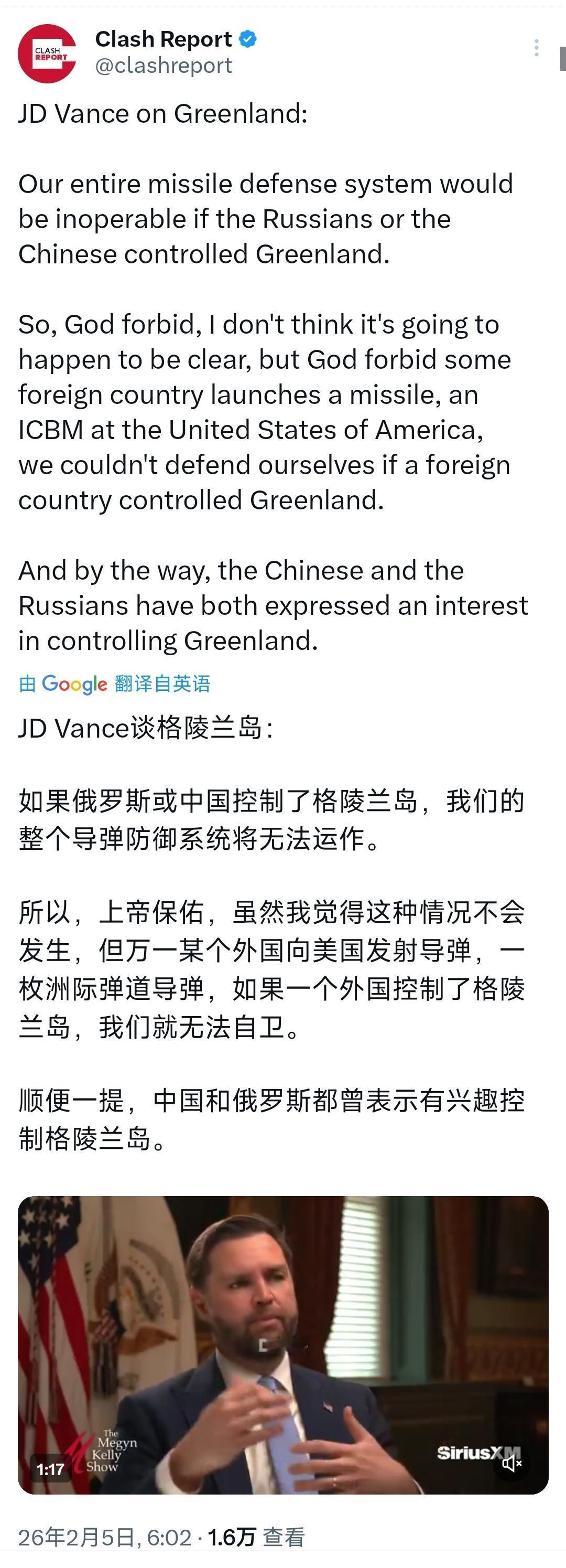 美国副总统JD万斯今天(北京时间2月5日)接受采访时谈到格陵兰岛:“如果俄罗斯或中国控制了格陵兰岛,我们的整个导弹防御系统将无法运作。所以,上帝保佑,虽然我觉得这种情况不会发生,但万一某个外国向美国发射导弹,一枚洲际弹道导弹,如果一个外国控制了格陵兰岛,我们就无法自卫。顺便一提,中国和俄罗斯都曾表示有兴趣控制格陵兰岛。” [机智]评几句:JD万斯这段炒作格陵兰岛的言论堪称美式霸权谎言的典型范本,毫无事实依据地捏造中国和俄罗斯企图控制格陵兰岛的谬论,渲染子虚乌有的导弹防御危机,本质是为美国觊觎格陵兰、谋求北极霸权找遮羞布。至少中国,从未有过控制格陵兰岛的主张,仅开展正常经贸合作,万斯的危言耸听连美国国内理性舆论都不买账,纯属政治操弄与地缘碰瓷,用颠倒黑白的叙事掩盖自身扩张野心,既冒犯丹麦与格陵兰岛的主权,也彻底暴露出美国动辄甩锅他国的霸权惯性,荒谬又可笑。