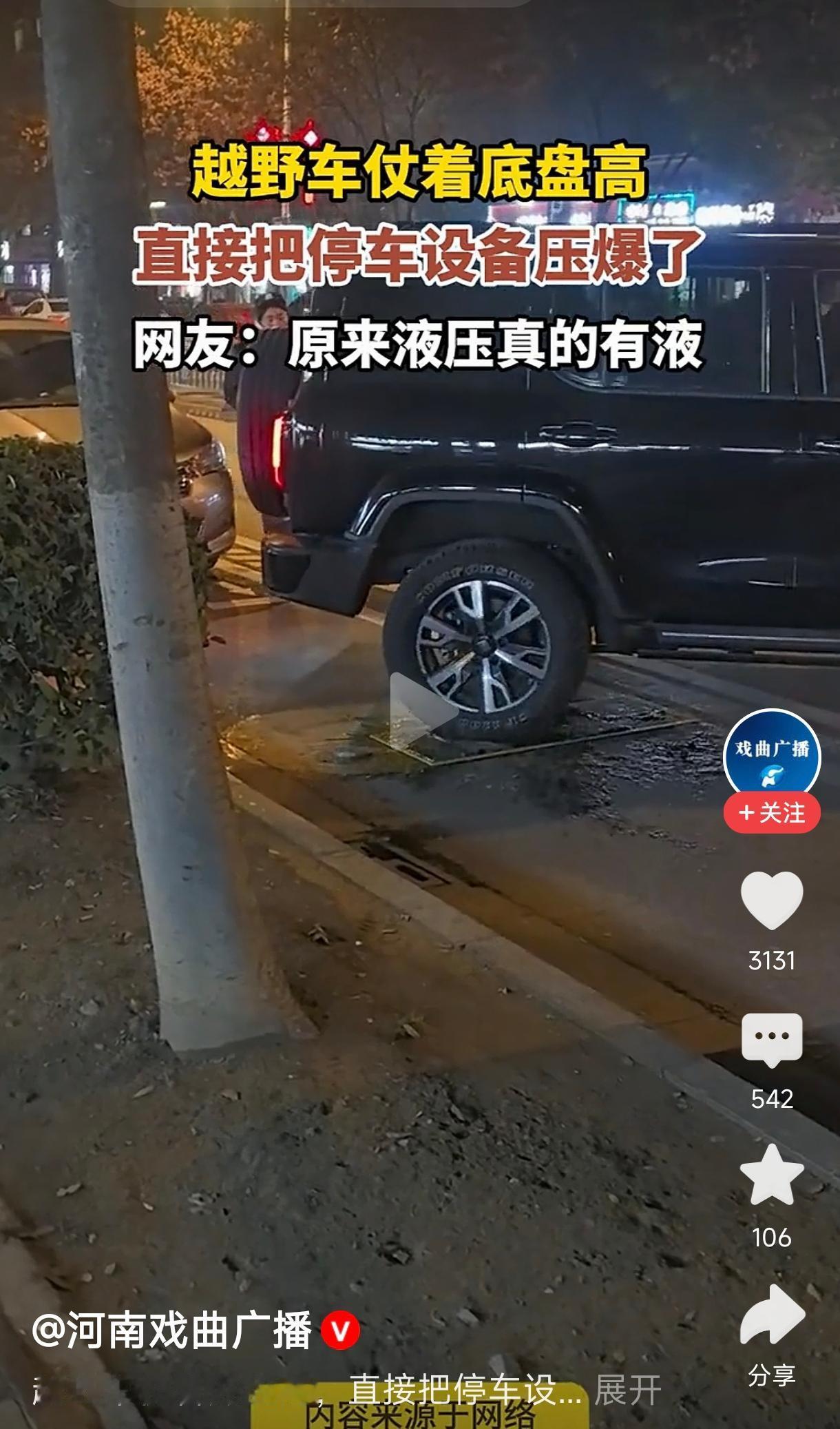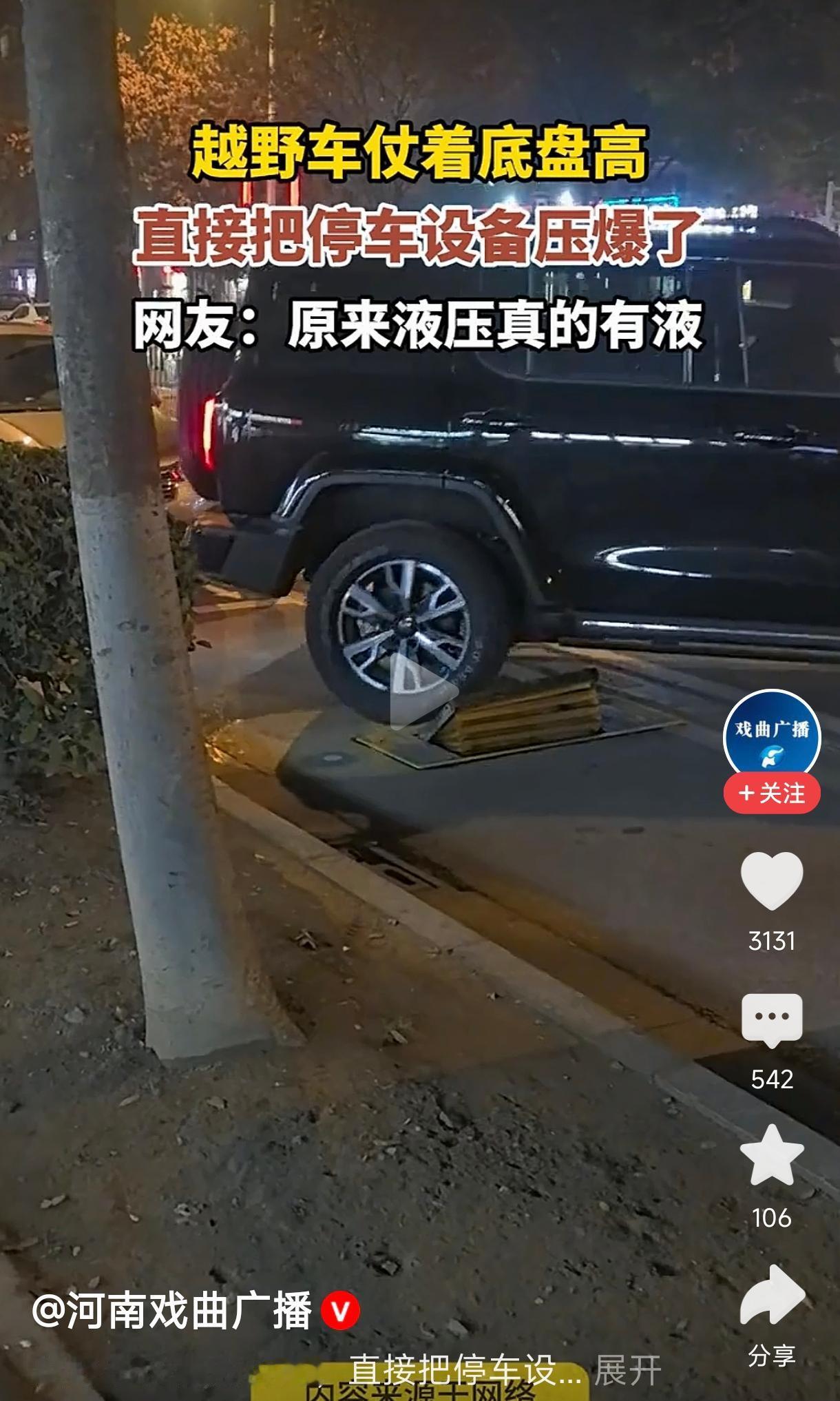 越野车把停车设备压爆了 越野车由于底盘较高,确实在一些情况下容易对停车设备造成损坏。建议在停车时注意观察周围的设施,选择合适的停车位置,避免对公共设施造成损坏,也保障车辆和他人的安全。如果需要,可以向相关管理部门报告损坏情况,以便及时修复。感谢您的关注和理解!越野设施 越野车陷车