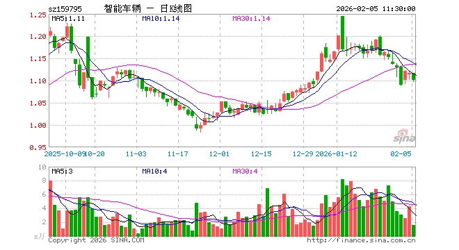 2月5日,截止午间收盘,智能汽车ETF汇添富(159795)跌1.43%,报1.101元,成交额171.96万元。智能汽车ETF汇添富(159795)重仓股方面,拓普集团截止午盘跌2.67%,豪威集团跌0.35%,科大讯飞跌1.69%,比亚迪涨0.98%,长安汽车涨1.26%,赛力斯跌0.97%,芯原股份跌7.44%,立讯精密跌0.37%,德赛西威涨0.09%,北京君正跌4.44%。