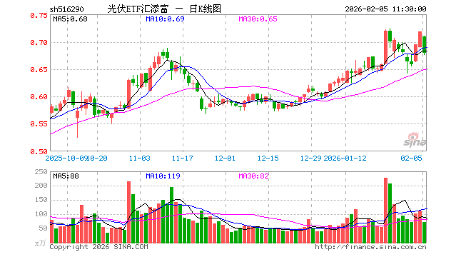 2月5日,截止午间收盘,光伏ETF汇添富(516290)跌5.43%,报0.679元,成交额4913.49万元。光伏ETF汇添富(516290)重仓股方面,特变电工截止午盘跌4.78%,隆基绿能跌5.64%,阳光电源跌4.39%,TCL科技跌0.61%,通威股份跌6.03%,迈为股份跌10.84%,德业股份跌3.90%,正泰电器跌4.14%,TCL中环涨0.57%,捷佳伟创跌11.51%。