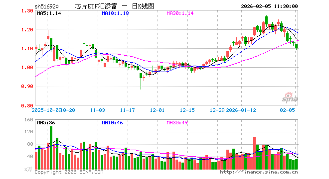 2月5日,截止午间收盘,芯片ETF汇添富(516920)跌2.31%,报1.101元,成交额3556.79万元。芯片ETF汇添富(516920)重仓股方面,寒武纪截止午盘跌1.59%,中芯国际跌3.24%,海光信息跌1.89%,北方华创跌2.00%,兆易创新跌2.49%,澜起科技跌2.47%,中微公司跌0.10%,豪威集团跌0.35%,拓荆科技跌4.39%,紫光国微跌2.36%。