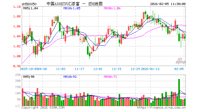 2月5日,截止午间收盘,中国A50ETF汇添富(560050)跌0.86%,报1.035元,成交额5793.30万元。中国A50ETF汇添富(560050)重仓股方面,宁德时代截止午盘跌1.93%,紫金矿业跌5.29%,贵州茅台涨1.41%,工业富联涨1.01%,中际旭创涨0.89%,比亚迪涨0.98%,寒武纪跌1.59%,洛阳钼业跌7.18%,招商银行涨1.03%,海光信息跌1.89%。