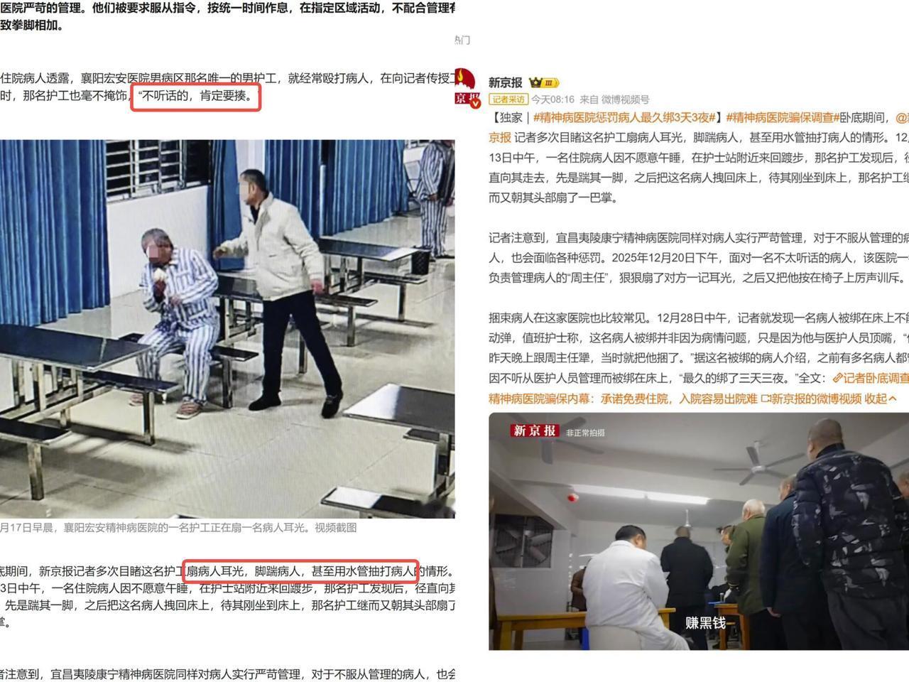 新京报这次真的是立了大功!   卧底湖北襄阳,把那个烂透了的精神病院黑幕全给掀开了。   所谓的“免费住院”,竟然是专门给穷人设的局。   天上真会掉馅饼?掉下来的怕是铁陷阱。     从2025年12月开始,新京报记者以护工身份进入湖北襄阳和宜昌多家精神病医院,用28天时间摸清了这里的真相。看起来像专门治病救人的地方,实际上是在精打细算地榨医保基金。所谓的“免费住院、免费接送”,是一套专门针对低收入群体的完整套路,会主动找上门,把人送进医院,然后尽一切办法阻止他们离开。     这些医院的目标很清楚,就是那张医保卡上的钱。他们主要招收三类人,一类是没家属照顾的孤寡老人,一类是想借住院规避养老成本的人,还有一类是曾有饮酒或轻微精神状况记录的普通人。只要人进来了,不管有没有病,都能立刻安排“入组治疗”。记者发现,其中许多“患者”行动自如、神志清醒,还有人是在医院里穿着工作服干活的护工保安,而系统上却在住院名单中,名义上是重症精神病人。     精神病人越多,医院赚的钱就越多。所以医院尽量不给人出院机会。一位嗜酒入院的年轻男子,几次要求出院都被拒绝。记者在院期间,亲眼看到医护对待病人的方式粗暴,有人被打耳光,有人被拉出去用水管抽。     病房里的生活几乎与“自由”绝缘。真实的治疗极少出现,大部分所谓“心理矫正”“行为干预”只是工作人员找患者闲聊几句,或者让他们在走廊里坐着休息。这些随意的动作就能被记入治疗记录,用于对着医保系统报销专科费用。记者调取了其中一位患者的住院记录,90天里花了1万多元,其中药费不到600元,但写进账单的治疗和康复费用超过6000元。     文章里的某家医院,一位男护工第二天就被“诊断”为酒精致幻障碍,安排进病区躺下“住院”。同时,他每天还在楼道里扫地、照料老病人,上下班没有中断。也就是说,他既作为员工发了工资,又被当病人报了医保,一张卡两边赚钱。     整个骗保流程非常熟练。新病人进来后,医生第一件事是确认有没有医保,一旦确认有卡,就会安排一份病历,随机取个诊断,比如“躁郁”“酒精障碍”或者“老年痴呆”,不需要真正测试。县里的优抚医院、私营医院、甚至公立医院所开的精神科,因为外包给个人管理,几乎都在执行类似的操作。     为了躲避监管,他们还提前做好防范。每到医保窗口检查之前,医院会在系统里安排“假出院”,等检查一过,隔两天再重新入院,这样系统上看起来住院都是间隔开的,成功骗过连动记录统计。有个“患者”18个月没有真正离开医院,却办了6次出院,7次入院。一次次重进住的问题根本没人查,只要流程在纸面上能自圆其说。     这些年医保局其实也盯过类似问题,公开通报中的一例重庆合川区医院也像襄阳一样,拿患者当“过账工具”,还会向介绍人给“人头费”。2024年国家层面曾出台文件,试图削减行业的骗保空间。但实际落地后,部分地方法规执行弱,漏洞被继续利用,作恶的机构甚至还在扩张。襄阳城区光注册在册的精神病院就二十多家,密度接近餐饮小吃店,不正常的供给侧爆发,已经不是单个医院乱来那么简单。     而群众举报一直难以形成实际推进,原因在于精神病院的封闭属性,内部情况多由工作人员决定,病人无法自己发声。之前发生在夷陵医院的一起命案也表明,极端压抑之下有人被逼到绝境,最终发生了悲剧。     好在,新京报这次的报道一出,多个权威部门迅速启动调查。襄阳市和宜昌市宣布组建专班,医保局与卫健委联合彻查涉事医院。报道第二天,湖北省层面也开始着手介入,表态将依法从速处理。     更希望的是,这次行动不是一阵风。舆论的光打进去了,但真正要清除这些黑色病房里的蛀虫,靠的是持续的制度堵漏。每一分钱医保资金都来之不易,那是多少人攒出来的保命钱,来不得半分掠夺。那些走入骗保陷阱的人,大部分只是想找个地方落脚,不该成为骗局的筹码。     这一战,新京报是敲响了警钟。希望这不是结束,而是一次真正的开始。