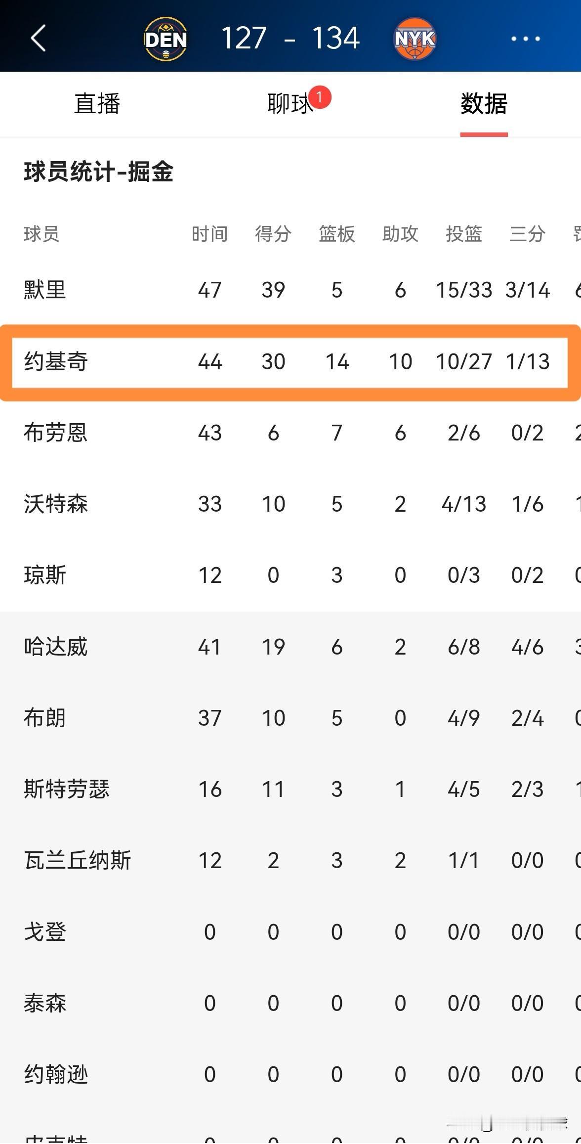 掘金当家球星约基奇的三分球就是一个大笑话!在今天掘金客场以127:134输给尼克斯的比赛中,约基奇在三分线外13中1,他的三分球命中率简直是惨不忍睹。 全场比赛下来,约基奇首发出战44分钟,投篮27中10,其中三分球13中1、罚球12中9空砍30分14篮板10助攻,还有4次犯规。 毫不客气的说,约基奇必须要为球队的失利负责,他在三分手感冰凉的情况下依然疯狂的出手三分球,这样的投篮选择真是让人极度的失望。