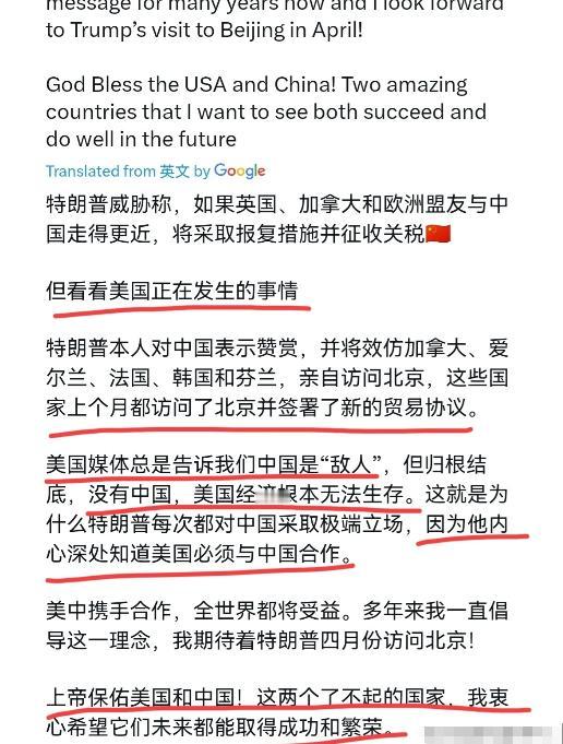 中美元首通话之后,2月5日,美国记者贾森写到,特朗普威胁英国、加拿大和欧洲盟友,如果他们与中国走得更近,美国将采取报复措施并加征关税。但看看美国正在发生什么!特朗普本人正在赞扬中国,并将亲自效仿加拿大、爱尔兰、法国、韩国和芬兰的脚步,高度期待访问北京,并与北京签署新的贸易协定。   先看美国国内的政治周期。2026年是美国中期选举年,特朗普所在的共和党在国会仅拥有微弱多数,保住席位成为当务之急。历史上,总统在中期选举前往往会采取务实的经济政策来提振选民支持率。   中国作为美国第二大贸易伙伴,其市场对美国农业、能源等产业的重要性不言而喻。特朗普此时释放访华信号,很可能是为了向选民展示他有能力通过对华合作创造就业和经济增长,从而在选举中争取更多支持。这种“胡萝卜加大棒”的策略,本质上是将外交政策工具化,服务于国内政治目标。   再看国际经济格局的变化。近年来,全球产业链供应链加速重构,美国试图通过“友岸外包”减少对中国的依赖,但实际效果并不理想。中国拥有全球最完整的制造业体系和庞大的消费市场,许多美国企业在华投资回报率远高于其他地区。   根据中国美国商会的调查,2025年超半数在华美企实现盈利或大幅盈利,近六成企业计划加大在华投资。   这种现实让特朗普政府意识到,完全切断与中国的经济联系既不现实也不符合美国利益。因此,在威胁盟友的同时,特朗普本人仍希望通过高层对话为美国企业争取更多市场准入机会,这种双重标准反映了美国在经济利益与政治意识形态之间的挣扎。   从盟友关系角度看,欧洲国家近年来明显加快了“战略自主”的步伐。德国、法国等欧盟成员国在新能源、数字经济等领域与中国的合作不断深化,英国也在探讨对华免签等议题。这种趋势让美国感到不安,因为传统盟友的离心倾向可能削弱美国的全球影响力。   特朗普威胁加征关税,表面上是阻止盟友“倒向”中国,实际上是试图维护美国在西方阵营中的主导地位。   但这种做法效果有限,欧洲国家更看重与中国合作带来的实际经济利益,对美国的胁迫式外交越来越抵触。例如,马克龙曾明确表示“不会成为美国的附庸”,这种态度在欧洲具有代表性。   值得注意的是,美国国内政治生态的分裂也在加剧这种政策矛盾。特朗普的“美国优先”理念虽然在部分选民中仍有市场,但越来越多的美国精英意识到,完全孤立中国不符合美国的长期利益。   国会中一些共和党议员开始呼吁与中国进行建设性对话,而民主党则更倾向于通过多边机制协调对华政策。这种内部分歧导致美国对华战略缺乏连贯性,政策摇摆不定。特朗普在访华问题上的表态,既是对国内务实派的回应,也是为了平衡党内激进势力的压力。   从地缘政治角度看,美国在亚太地区的战略布局也需要中国的配合。尽管美国试图通过“印太战略”围堵中国,但在朝鲜半岛核问题、气候变化等全球性议题上,仍离不开与中国的合作。   特朗普计划在访华期间讨论芬太尼关税、科技制裁等议题,本质上是希望通过谈判解决一些长期困扰两国关系的问题,为美国争取更多战略空间。这种“竞争与合作并存”的模式,可能成为未来中美关系的常态。   需要指出的是,特朗普的这种策略并非没有风险。过度依赖关税威胁可能导致盟友关系进一步恶化,而访华如果不能取得实质性成果,反而会削弱他在国内的政治资本。   此外,中国在核心利益问题上的立场坚定不移,任何试图通过施压获取利益的做法都不会得逞。中美关系的健康发展需要双方的共同努力,而不是单方面的胁迫或投机。   特朗普政府当前的对华政策呈现出明显的矛盾性,这种矛盾既是美国国内政治博弈的结果,也是国际经济格局演变的必然反映。   对华鹰派和反华分子如果不能正视这种现实,继续抱持冷战思维,最终只会损害美国自身的利益。中美两国作为全球前两大经济体,合则两利、斗则俱伤,这是任何人都无法否认的客观事实。