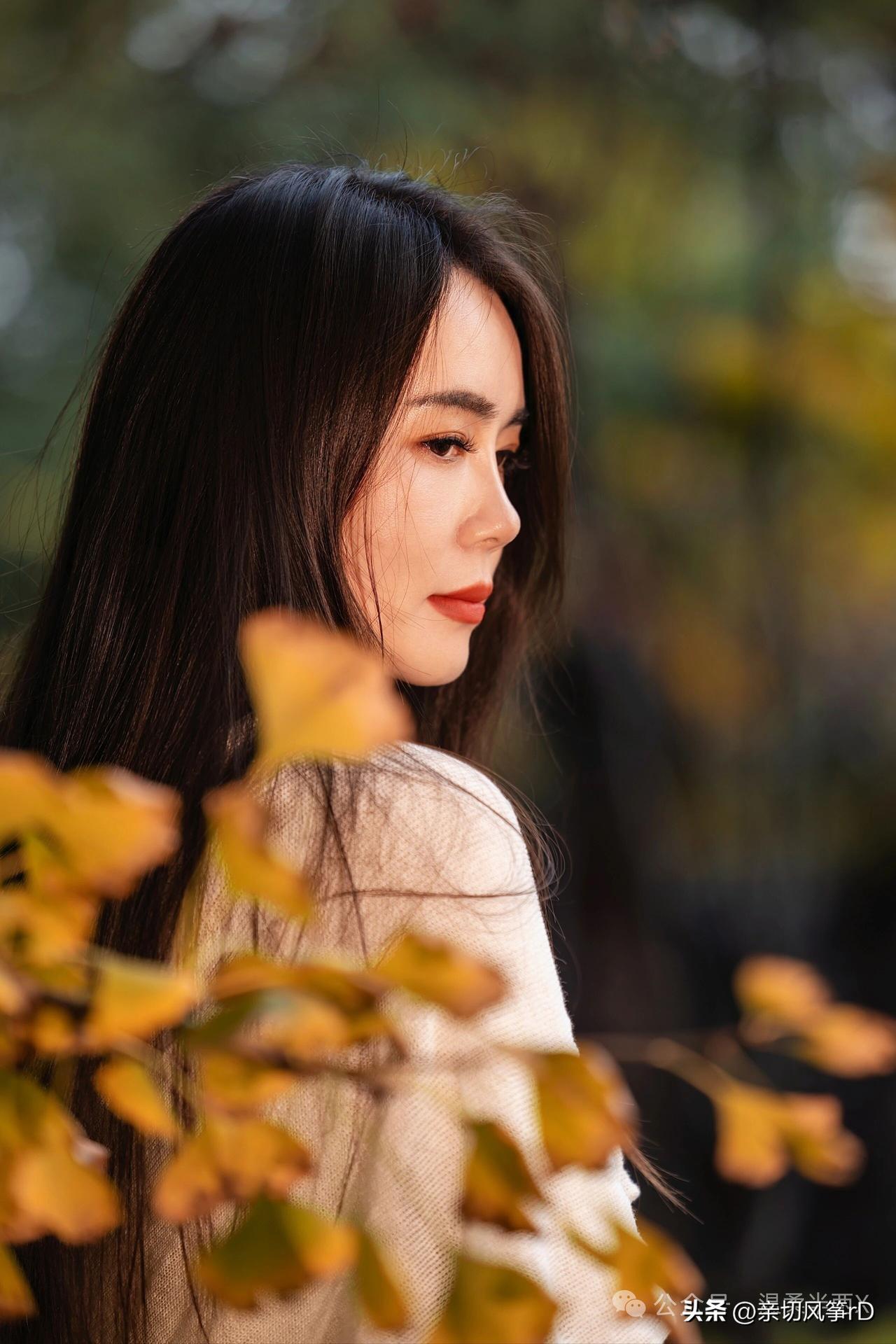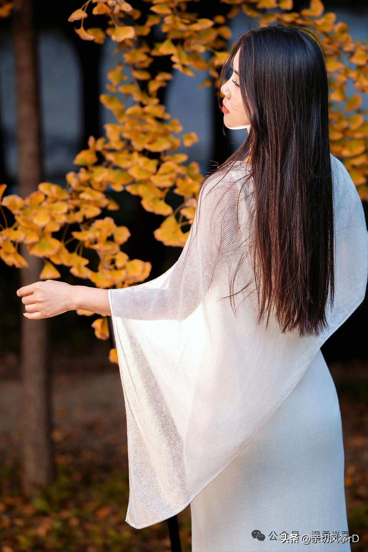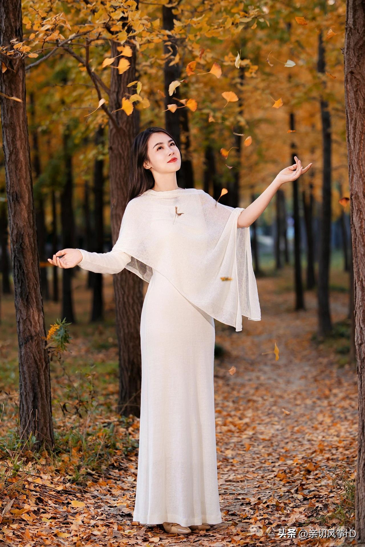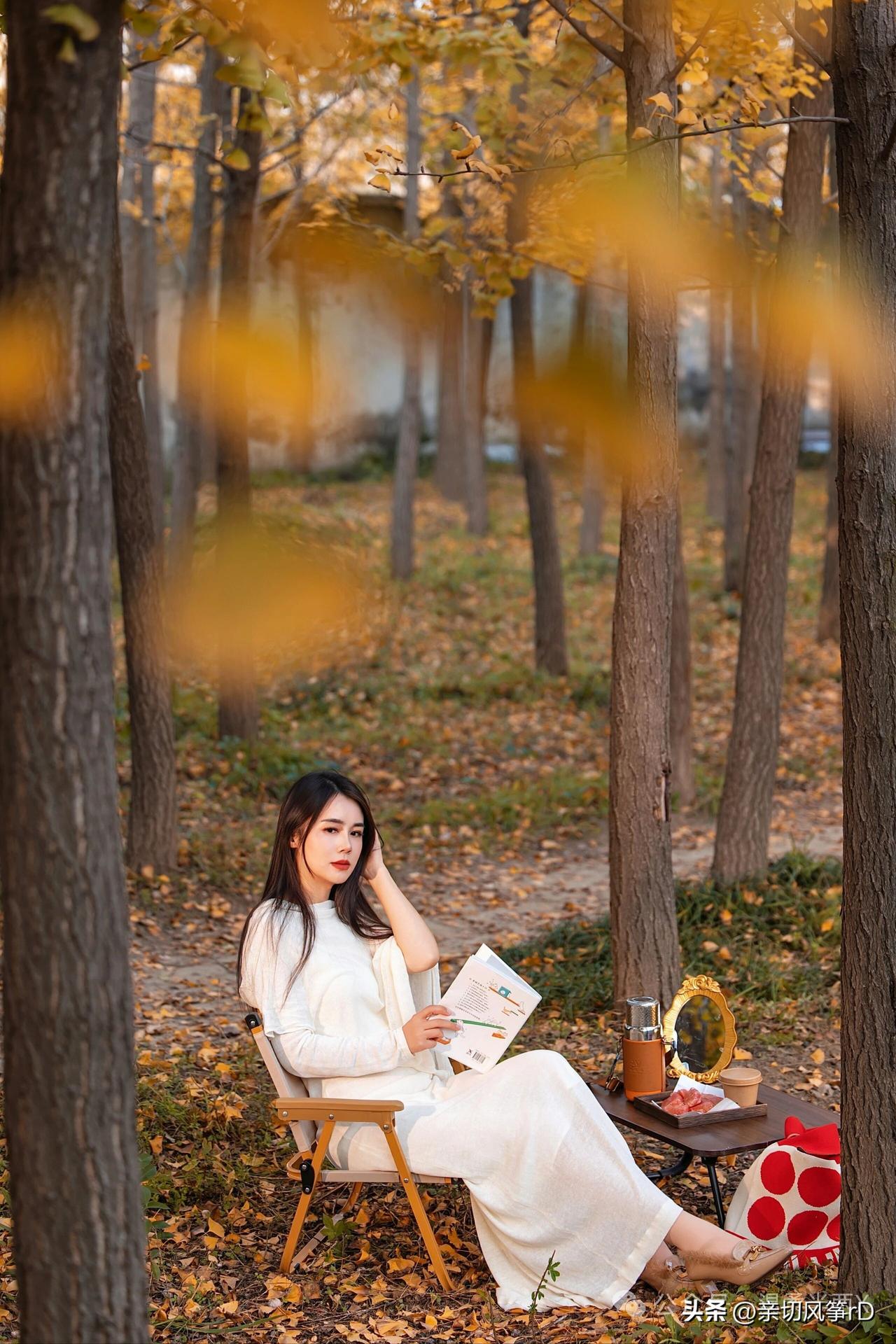 秋日暖阳下,白衣少女静立树旁,落叶纷飞,岁月静好。