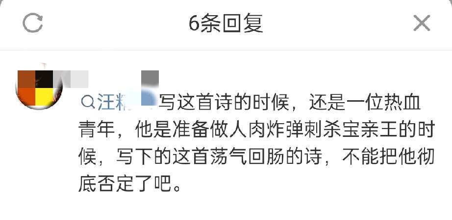 某大V被取消关注了,但我个人感觉只是取消关注的话,那么这个惩罚稍微有点轻了!我给大家看一下他的书房里悬挂了谁的诗句,没错就是汪某人的。 另外我还看到在评论区里面,还有死忠替他辩白,说什么汪某人的这首诗没有什么问题,因为汪某人在当时行刺过宝亲王。 对此我想说,不愧是他的粉丝,连乾隆跟载沣都分不清楚的情况下,就敢出来替他辩白。再次印证了那句俗语,物以类聚人以群分。