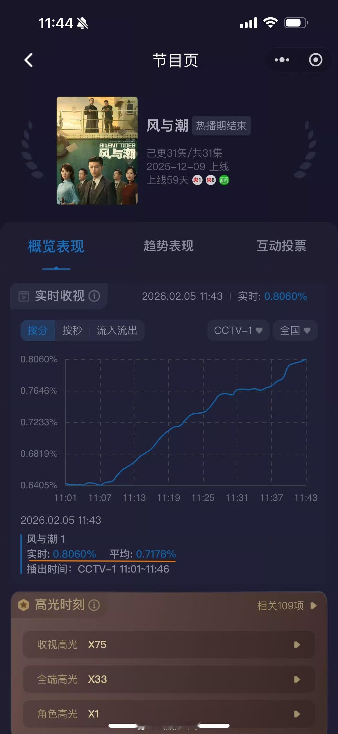 【任嘉伦风与潮央一重播首日收视第一,且拉升收视率超25%】风与潮央一重播 酷云平均收视率0.7211% ,峰值为0.806% !位列上午档收视率全国第一