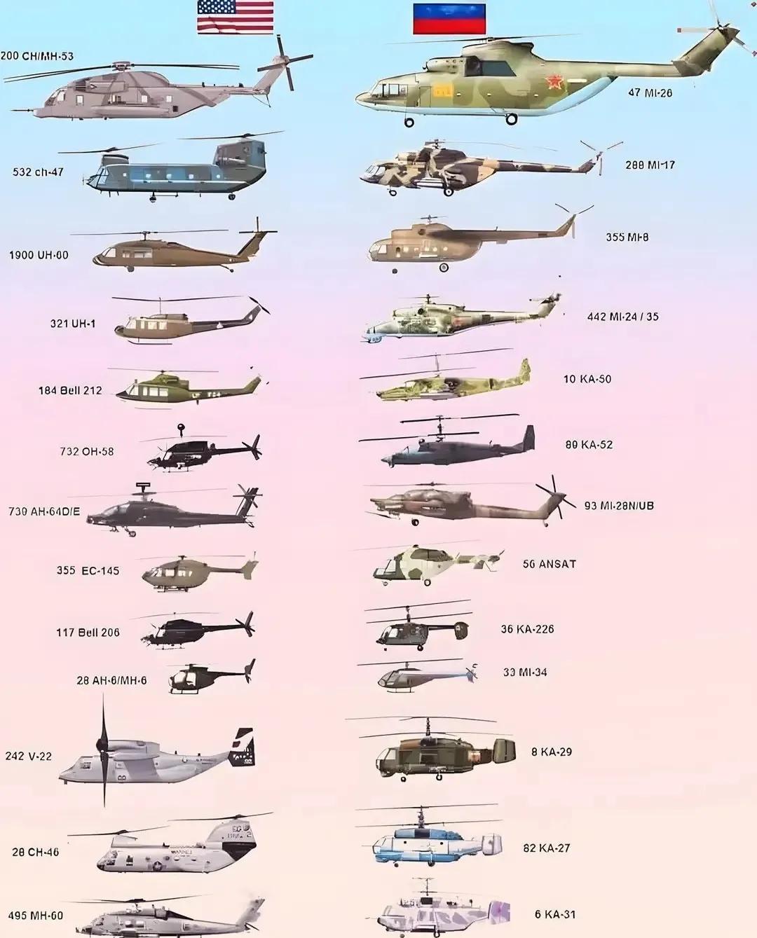 直升机的制造水平最能反应一个国家航空科技的强弱,顶级航空强国都是直升机制造强国,其中美俄又是最强的两家,他们生产制造的直升机产品序列最丰富,开发的机型和种类最多,其中的许多机型是其他国家无法生产的,象CH53,米26,支奴干这样的直升机虽然都问世几十年了,但至今还没有别的国家能制造出与它们竞争的产品 。