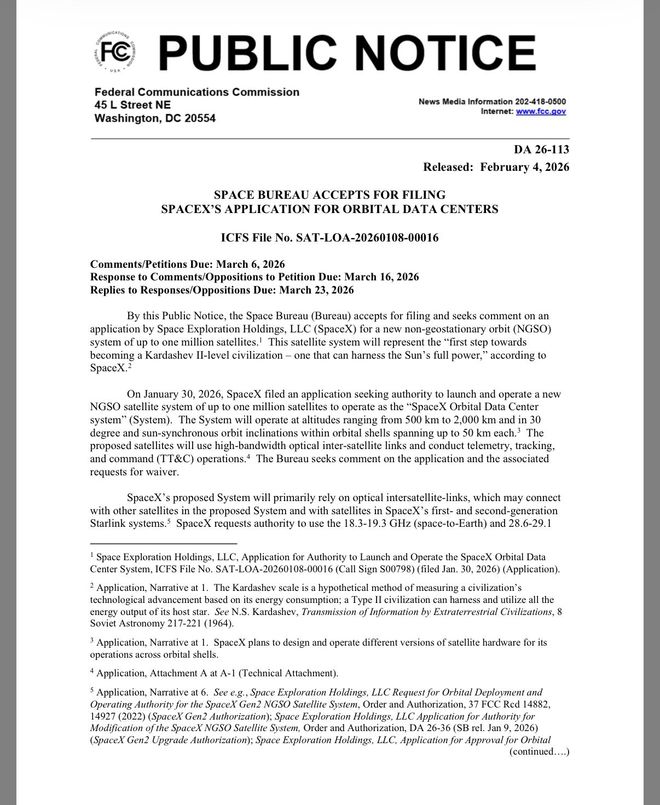 美国联邦通信委员会主席布伦丹·卡尔(BrendanCarr)在社交媒体平台上发文称:“美国联邦通信委员会欢迎SpaceX公司提交的轨道数据中心申请,并现征求公众意见。”