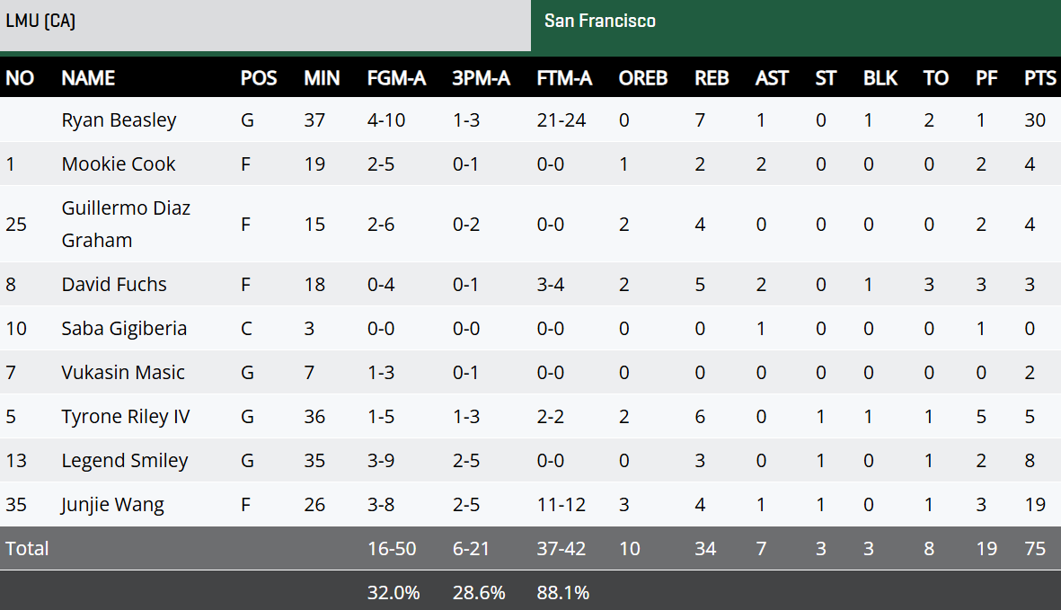 虎扑02月05日讯今日NCAA常规赛,旧金山大学75-84不敌洛约拉马利蒙特大学。