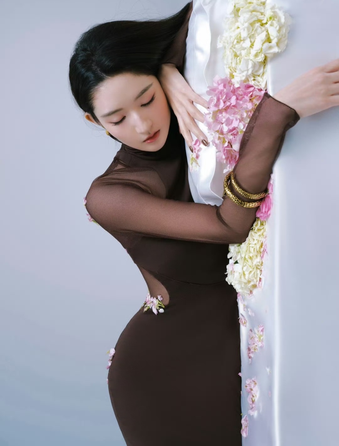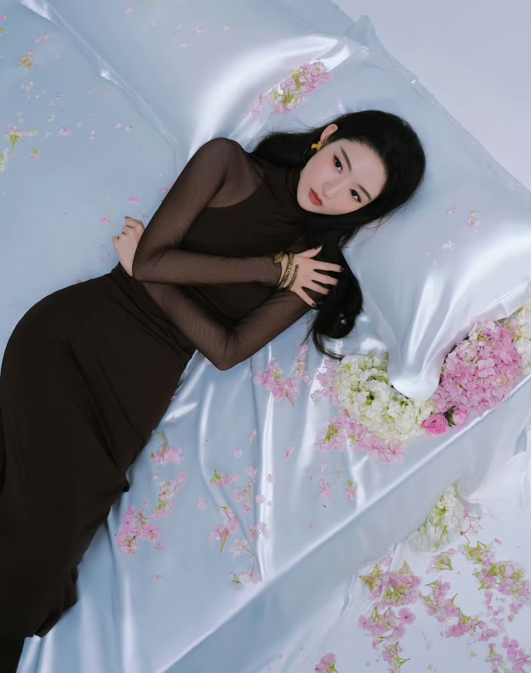 若隐若现的透纱小心机,搭配蛇形手镯的酷感,和满床粉白绣球花的柔美感撞得恰到好处。