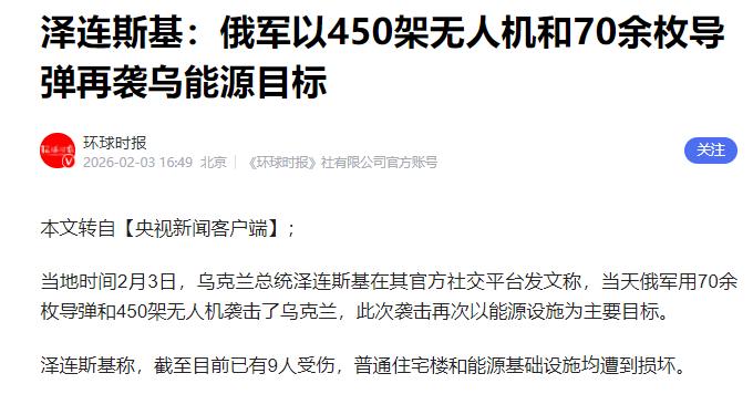 果然被我猜中了! 乌克兰总统泽连斯基宣布: 2月3日,乌克兰总统泽连斯基在官方社交平台发文称,当天俄军用70余枚导弹和450架无人机袭击了乌克兰,此次袭击再次以能源设施为主要目标。 俄军这次动手,可不是一时脑子热,背后的心思特别明确,而且早有铺垫。 就在袭击的前一天,北约秘书长吕特偷偷去了基辅,在乌克兰议会发表讲话,话里话外都在暗示,只要乌克兰签署和平协议,北约的部分国家就会出兵进驻乌克兰。 可俄罗斯早就把话撂得很明白,绝不允许北约部队踏进乌克兰半步,这次大规模炸能源设施,说白了就是给西方和乌克兰一个下马威。 除此之外,之前乌克兰主动撕毁双方默认的能源设施停火默契,动用海马斯远程火箭炮和自杀式无人机,越境袭击俄罗斯别尔哥罗德边境城镇,炸毁民房还造成无辜百姓身亡。 俄罗斯这也是在回应那次袭击。 面对俄军这么密集、这么精准的打击,乌克兰也没有坐以待毙,一直在拼尽全力应对,只是这份努力,实在太难看到成效。 为了让老百姓能活下去,乌克兰政府在各地弄了上千个临时取暖点,光基辅就有1200多个,还有不少被称为“无敌点”的紧急避难所,设在学校、便利店甚至地铁站里。 同时,他们还组织了几十支抢修队伍,24小时连轴转,拼了命想把被炸坏的能源设施修好。 除此之外,乌克兰也一直在向欧洲各国求助,好在不少国家也伸出了援手。 意大利已经交付了78台工业锅炉,总容量超过112兆瓦,能满足约9万户家庭的供暖需求。 德国、波兰给了不少资金和发电机,其中波兰承诺的400台发电机,已经有一批运抵基辅,剩下的也在陆续运输中。 荷兰、瑞士、芬兰等国,也送来了变压器、配电板之类的能源装备,欧盟还专门提供了1.7亿美元的人道主义援助。 可就算做了这么多努力,乌克兰的困境还是没法真正缓解,甚至可以说越来越艰难。 俄军的袭击太频繁了,抢修队伍就算24小时不停工,修复的速度还不到被破坏速度的三分之一,根本赶不上节奏。 而且乌克兰的能源设备本身就老旧,战前40%的电网设备就已经运行超过25年,都是苏联时期遗留下来的“老古董”,本身就故障频发。 乌克兰的燃料储备也快见底了,再加上前线补给线被切断,士兵连吃的、用的都难运进来,星链卫星网络也频繁掉链子,通信经常中断,战斗力大幅下降,长期这么下去,根本撑不住。 也正因为这样,泽连斯基才明确表示,会根据这次能源设施遭袭的情况,调整接下来在阿联酋阿布扎比举行的三方会谈策略。 俄乌冲突已经持续了很长时间,这样的袭击一次又一次发生,不管对俄罗斯还是乌克兰,都没有任何好处,只会让更多家庭破碎,让更多人承受战争的苦难。 真心希望双方能冷静下来,放下分歧,找到和平解决矛盾的办法,别再让无辜的老百姓为战争买单。