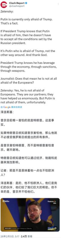 乌克兰总统泽连斯基今天(北京时间2月5日)接受采访时表示:“普京目前唯一害怕的就是特朗普。这是事实。如果特朗普总统知道普京害怕他,那么他就不必接受俄罗斯总统提出的所有条件。是普京害怕特朗普,而不是特朗普害怕普京。谢天谢地。特朗普总统知道他可以通过经济,制裁和武器来施加影响。” 记者追问道:那是不是意味着他一点也不怕欧洲人?泽连斯基表示:“是的,他不怕欧洲人。他们是我们的伙伴,他们给了我们巨大的帮助。但不幸的是,普京并不怕他们。” 普京怕特朗普,不是空穴来风。回溯2025年,特朗普刚上任就和普京通了90分钟电话,聊完直接宣布“俄乌立即启动停火谈判”。 当时泽连斯基在基辅攥着笔杆子,听着美方传来的消息——特朗普说“俄罗斯想和美国做大生意”,普京则回应“愿意起草和平备忘录”。这种隔空喊话的威慑力,比欧洲领导人的联合声明管用得多。 去年9月,泽连斯基向特朗普要一款“能逼普京谈判的武器”,特朗普一句“我们会研究”,让克里姆林宫当晚就召开了紧急防务会议。 特朗普手里的牌,是普京最头疼的组合拳。经济上,他威胁要对俄罗斯能源基础设施“定点打击”,去年冬天俄军后勤吃紧,正是因为美国无人机频繁光顾顿巴斯的炼油厂;军事上,特朗普批准的“弹簧刀”无人机和远程火箭炮,让乌军在南线反攻时撕开缺口。 最关键的是,特朗普敢直接说“乌克兰可以放弃库尔斯克部分土地换和平”——这种打破欧洲“恢复2014年边界”共识的表态,反而让普京摸不清底线。去年10月,特朗普突然搁置与普京的会晤,理由是“不想浪费时间”,俄方当天就释放了3名被扣的乌军士兵。 泽连斯基说“普京不怕欧洲人”,不是否定援助。2025年欧盟给了乌克兰240亿欧元军援,德国的“豹2”坦克、法国的“凯撒”大炮确实管用。 但问题在于,欧洲的援助总带着“政治正确”的枷锁。比如马克龙每次送武器,都要强调“不针对俄罗斯本土”,朔尔茨到现在还拒绝提供远程导弹。 对比之下,特朗普去年9月直接批准乌军袭击克里米亚的俄军弹药库,白宫发言人隔天轻描淡写:“这是自卫行动。”这种不加掩饰的支持,让普京明白:美国的威胁是真敢落地的。 乌克兰总统办公室的消息人士透露,泽连斯基本月拒绝了欧盟提出的“分阶段停火”方案,坚持要等特朗普的“最终方案”。 这背后是残酷的现实:2025年欧洲议会选举后,波兰、匈牙利等国对援乌的支持率下降了18%,而特朗普的民调支持率在摇摆州上升了9%。去年12月,泽连斯基在慕尼黑安全会议上特意坐在特朗普旁边,散会后对记者说:“美国的承诺,比27国联合声明更重。” 普京不怕欧洲,是因为知道欧盟的制裁有上限——德国去年冬天偷偷进口了120万吨俄煤,意大利至今没完全禁止俄天然气。 但特朗普不一样,他在2025年5月直接冻结了俄罗斯央行3000亿美元资产,还威胁要让美元退出对俄贸易结算。 这种“伤筋动骨”的手段,让克里姆林宫的经济顾问承认:“特朗普的制裁,比2014年以来所有制裁加起来都狠。”更关键的是,特朗普懂普京的软肋——去年12月,当特朗普在社交媒体晒出俄军在顿巴斯的伤亡数据时,克里姆林宫罕见沉默了48小时。 泽连斯基的话,撕开了俄乌冲突的“权力底牌”:欧洲是道义伙伴,美国是生存筹码。当普京在克里姆林宫看着特朗普的最新表态时,他算的不是谁更“硬汉”,而是谁的威胁更致命。这不是个人恩怨,而是大国博弈中最朴素的法则——子弹的射程,永远比口号更远。