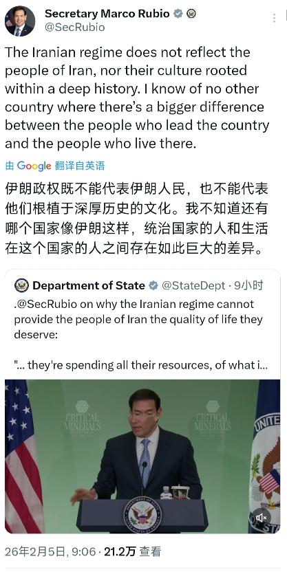 美国国务卿鲁比奥今天(北京时间2月5日)强硬对伊朗喊话称:“伊朗政权并不能代表伊朗人民,也无法体现其深厚历史底蕴所孕育的民族文化。我从未见过还有哪个国家像伊朗这样,其国家领导层与普通民众之间存在如此巨大的差异。” 鲁比奥的表态与近期美伊互动密切相关。就在同一天,伊朗外长阿拉格齐回应特朗普言论时重申,伊朗不寻求发展核武器,愿意通过外交途径解决争端。然而,美伊核谈判却陷入僵局。 原定于2月6日在伊斯坦布尔举行的多国会谈因双方分歧取消,后经中东国家斡旋才改在阿曼举行间接谈判。 美国要求将弹道导弹计划和地区代理人问题纳入谈判,伊朗则坚持只讨论核问题。这种立场差异,凸显了双方在核心利益上的尖锐对立。 美伊之间的紧张关系,有其深刻的历史和现实根源。自2018年美国单方面退出伊核协议以来,双方关系持续恶化。美国对伊朗实施“极限施压”,包括对能源、金融等领域的制裁,导致伊朗经济陷入困境。 2025年1月,美国财政部宣布对伊朗内政部长及多名革命卫队高级官员实施制裁,欧盟也将革命卫队列为恐怖组织。这些措施加剧了伊朗国内的经济危机,里亚尔对美元汇率跌至历史低点,通货膨胀严重影响民众生活。 经济困境引发了伊朗国内的社会动荡。2025年12月底以来,伊朗多地爆发抗议活动,起因包括货币贬值、物价上涨和政府削减补贴。抗议活动迅速蔓延至全国,参与者不仅有商人、学生,还包括普通家庭。 伊朗政府采取断网、镇压等措施应对,据伊朗国家安全委员会公布的数据,骚乱已造成3117人死亡。尽管政府推出每月1000万里亚尔的补贴计划,但未能平息民众不满。抗议者的诉求从经济问题转向政治改革,甚至出现要求推翻现政权的声音。 鲁比奥的表态,正是在这样的背景下发出的。他试图通过批评伊朗政权,为美国的外交政策争取支持。 美国政府认为,伊朗领导层的政策导致了民众的苦难,而美国的制裁和施压是为了推动伊朗政权改变行为。 然而,伊朗政府则将抗议活动归咎于外部势力的干涉,称其为“美国和以色列策划的阴谋”。伊朗总统佩泽希齐扬表示,政府愿意倾听民众诉求,但不会容忍外部势力的干预。 美伊关系的紧张,也对地区安全产生了重大影响。美国在中东地区加强军事部署,向伊朗周边派遣航母和战机。 以色列则多次威胁要对伊朗核设施发动打击。伊朗方面则加强军事戒备,革命卫队在霍尔木兹海峡举行实弹演习,并警告将对任何军事打击进行报复。这种军事对峙,增加了地区冲突的风险。 鲁比奥的表态,还反映了美国国内政治的考量。特朗普政府内部在对伊政策上存在分歧,副总统万斯等官员反对军事干预,主张通过外交途径解决问题。而鲁比奥等鹰派人物则推动对伊强硬政策,认为这是“低成本、高回报”的选择。这种内部分歧,使得美国对伊政策更加复杂和不确定。 对于伊朗来说,如何应对当前的经济和政治危机,是一个重大挑战。伊朗政府需要在稳定国内局势和推动经济改革之间找到平衡。 同时,伊朗也需要在外交上争取更多支持,以缓解国际压力。而对于美国来说,如何在不引发地区冲突的前提下实现对伊政策目标,也是一个需要谨慎考虑的问题。 鲁比奥的表态是美伊关系紧张的一个缩影。它反映了双方在核心利益上的对立,也揭示了伊朗国内政治经济的深层次矛盾。 未来,美伊关系的走向将取决于双方的政策选择,以及地区和国际环境的变化。在这个过程中,伊朗人民的福祉和地区的和平稳定,都将受到重大影响。