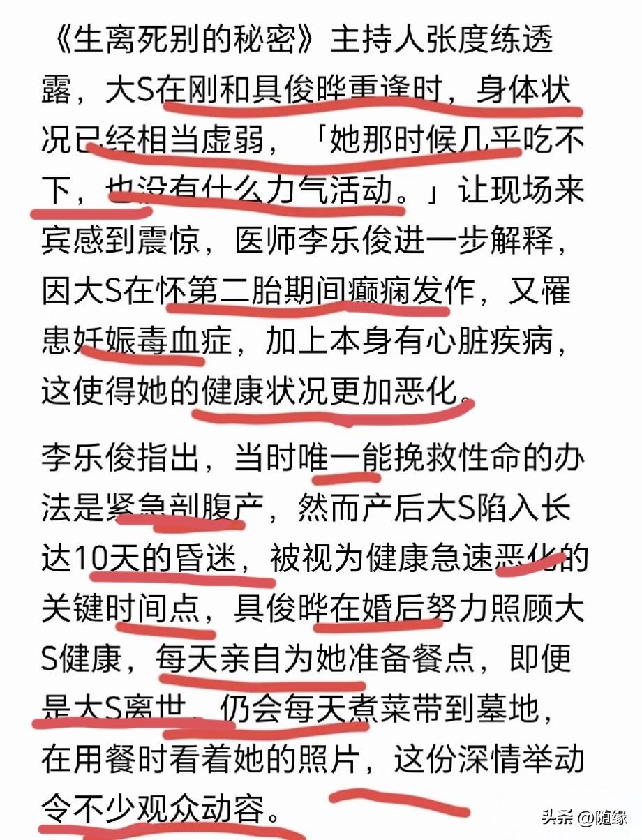 大家都低估具俊晔“深情”了! 他透过韩媒爆料,大S刚嫁给具俊晔时,身体状况就已经相当虚弱了,几乎吃不下东西,也没有什么力气。而原因竟然归咎于生二胎期间,癫痫病发作后引发健康状况更加糟。好在,后来有具俊晔细心照顾…… 难怪大S生前一直不出来工作,难怪她需要具俊晔背去WC,需要喂饭,原来身体状况早就出了问题。 不过,大S和具俊晔结婚后,小S一直对外说姐姐身和心都很健康,让大家不要乱猜测,到底谁在说谎?具俊晔又为什么选择一年后说出“实情”?