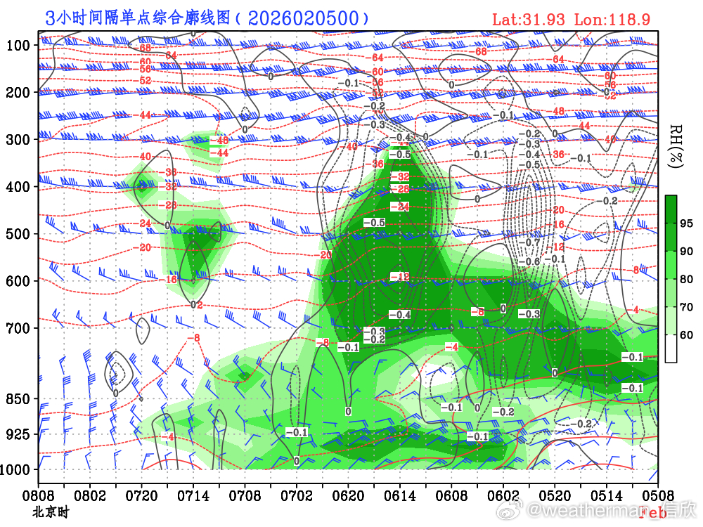 上海类似南京,也是850百帕附近湿度稍微有点低。但925百帕到地面层很潮湿,中间这个脱节使得降水也可能不是很强。但偏向于还是有。而且17时的0℃层明显降低,重点降雪在17-21时期间,之后水汽动力的配合就不太行了。