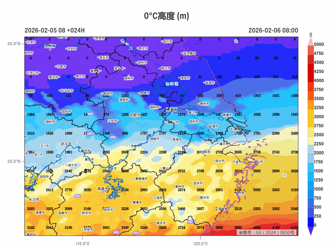 临近预报差异还如此大,说明预报的难度不小。低空暖湿气流的强度、冷空气的强度,依然是影响降雪的两个关键变数。重点的降雪时段还是6日午后到7日凌晨。图4为6日08时-7日08时,0℃层高度预报,降至250米以下时,利于降雪。